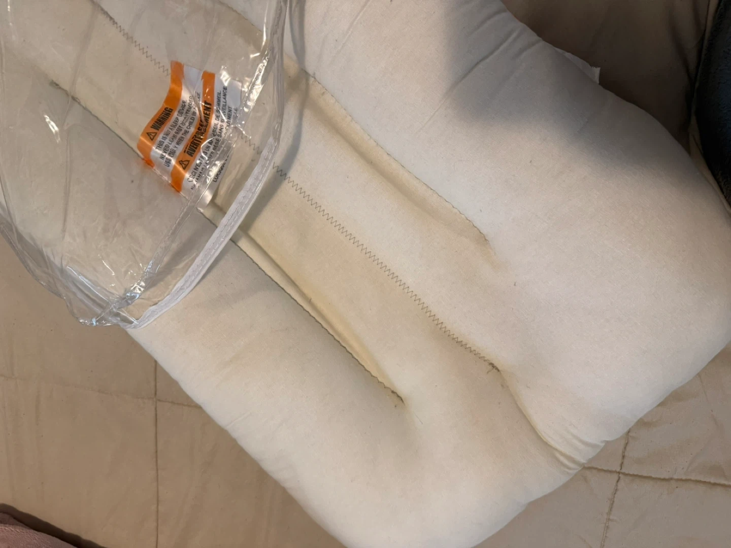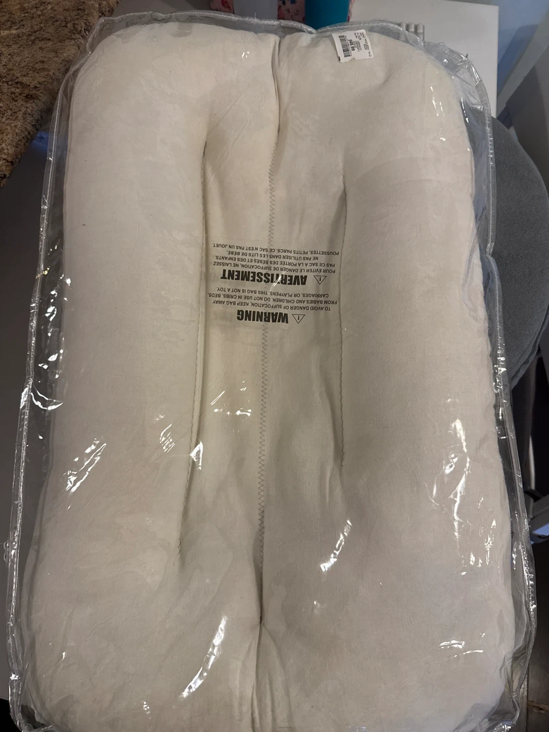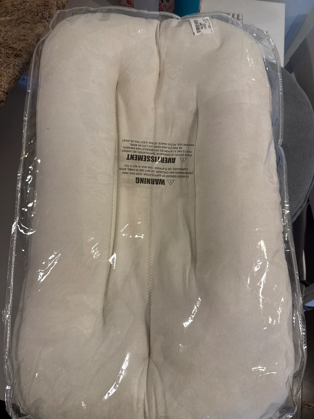 Selling a used like new newborn lounger, still in its original packaging! The lounger is made of rayon material and is a neutral colour. The tag shows it originally retailed for $49.99. For Sale: Baby Sleep Lounger (similar to Snuggle Me) – White Color