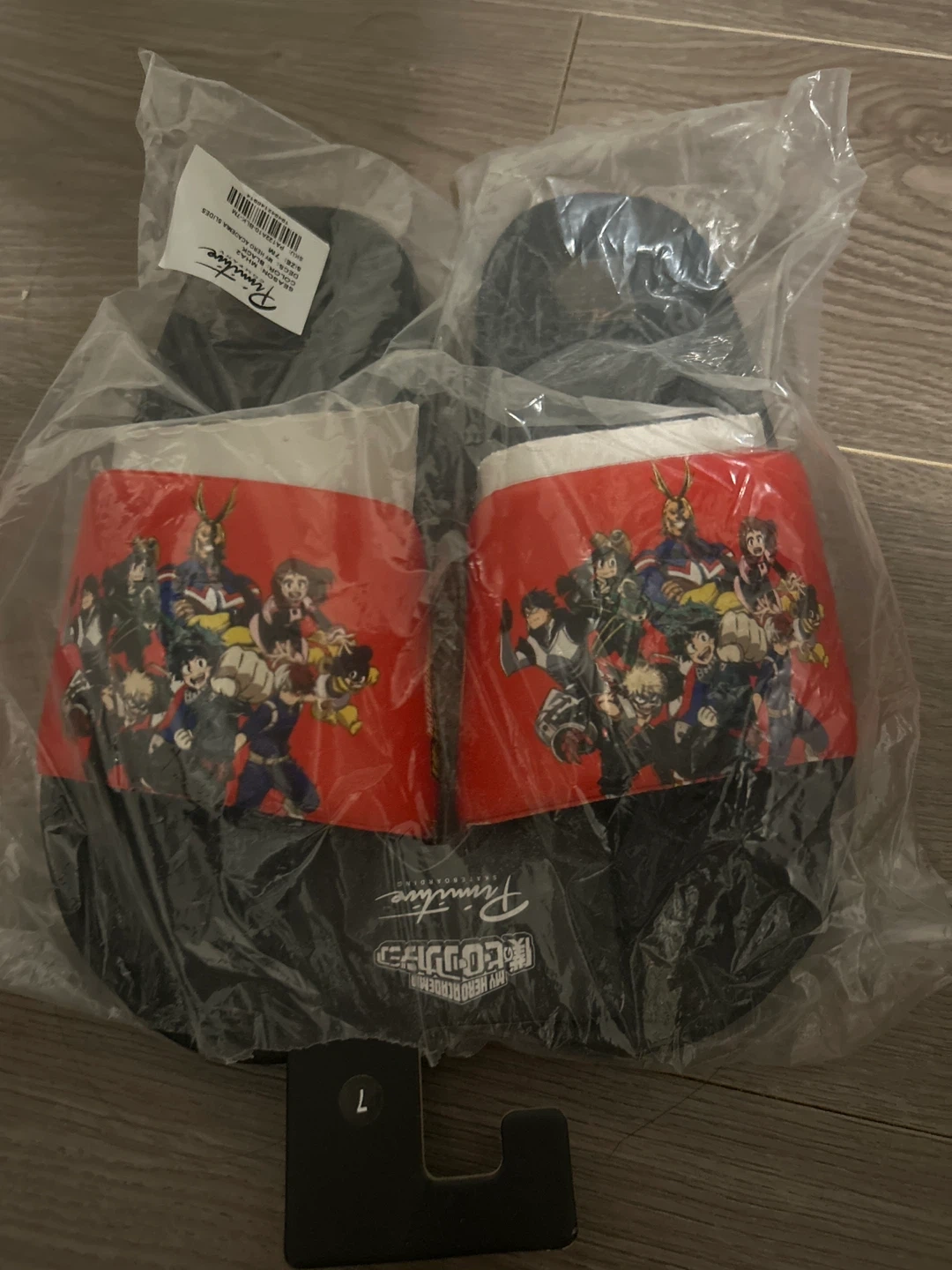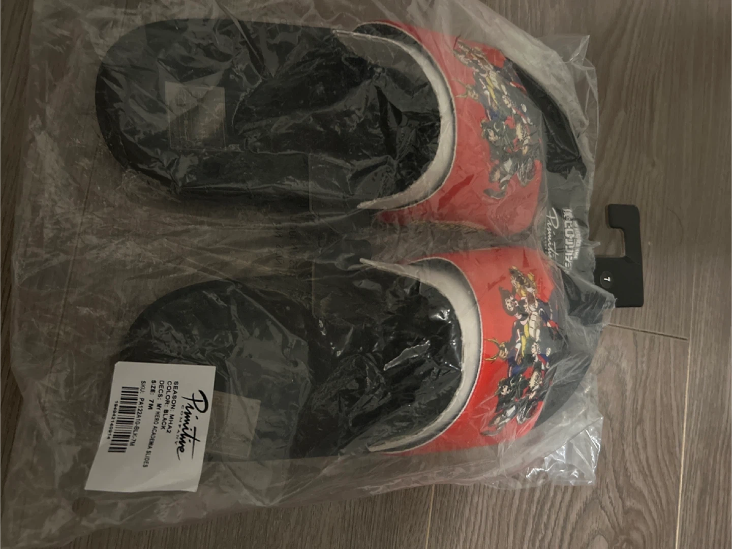 These are a pair of Primitive brand slides featuring a My Hero Academia design. They are a size 7 and appear to be in new condition, still in their original packaging. The slides have a red band with a graphic of My Hero Academia characters on each foot.