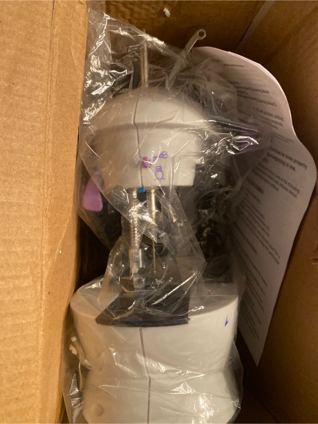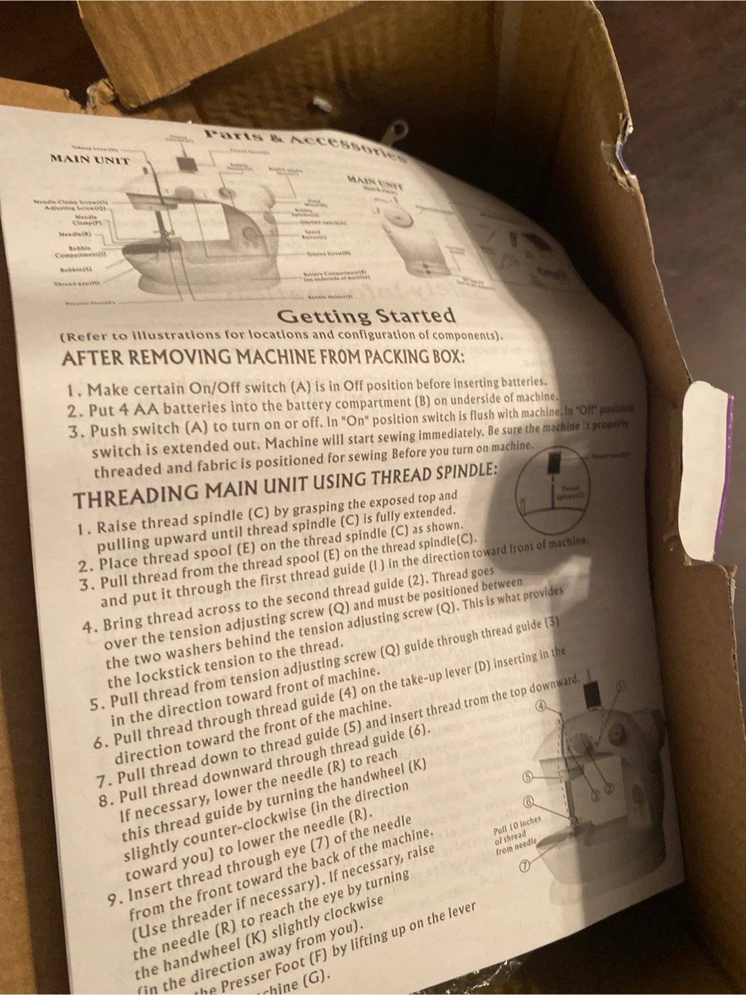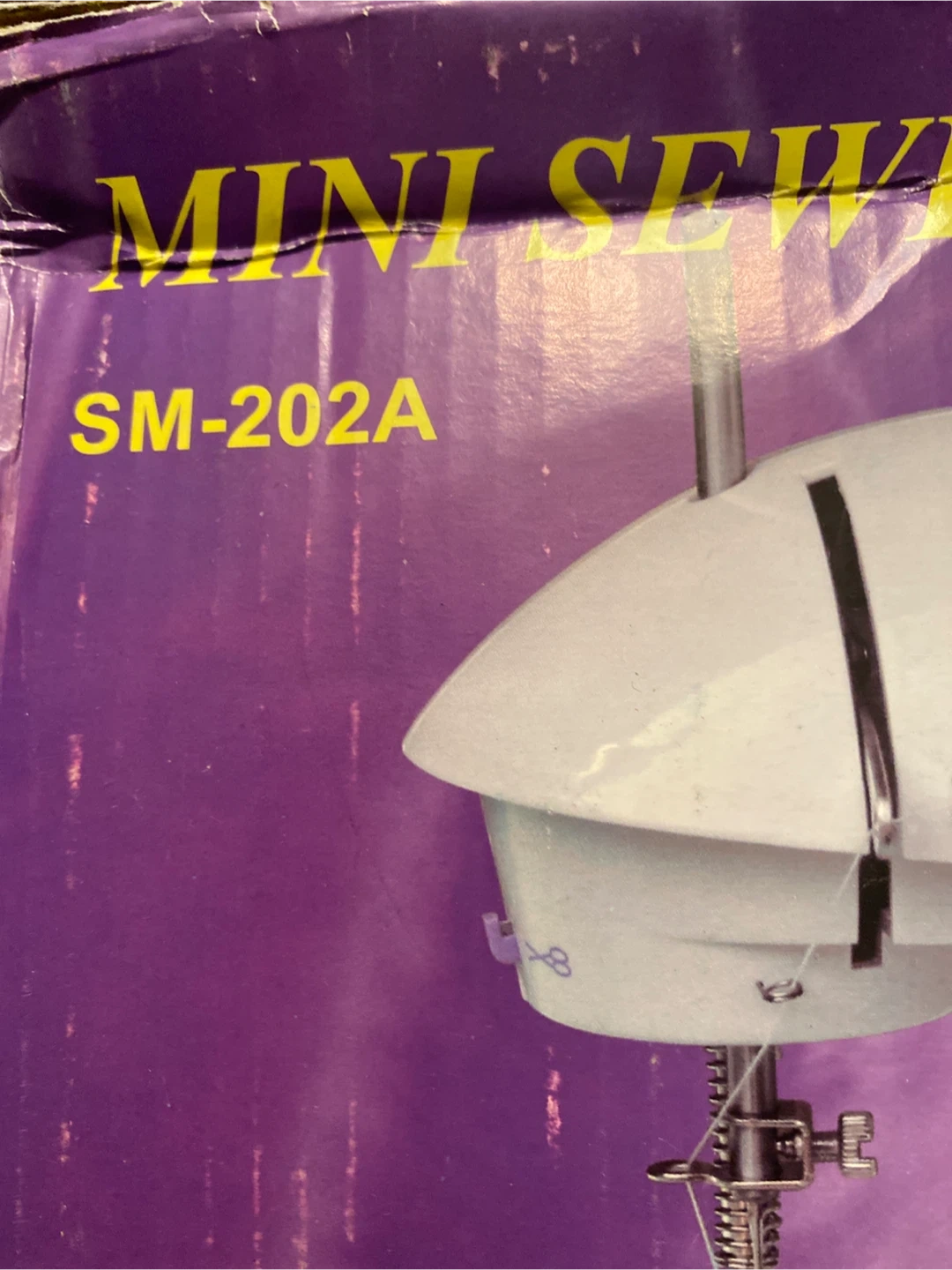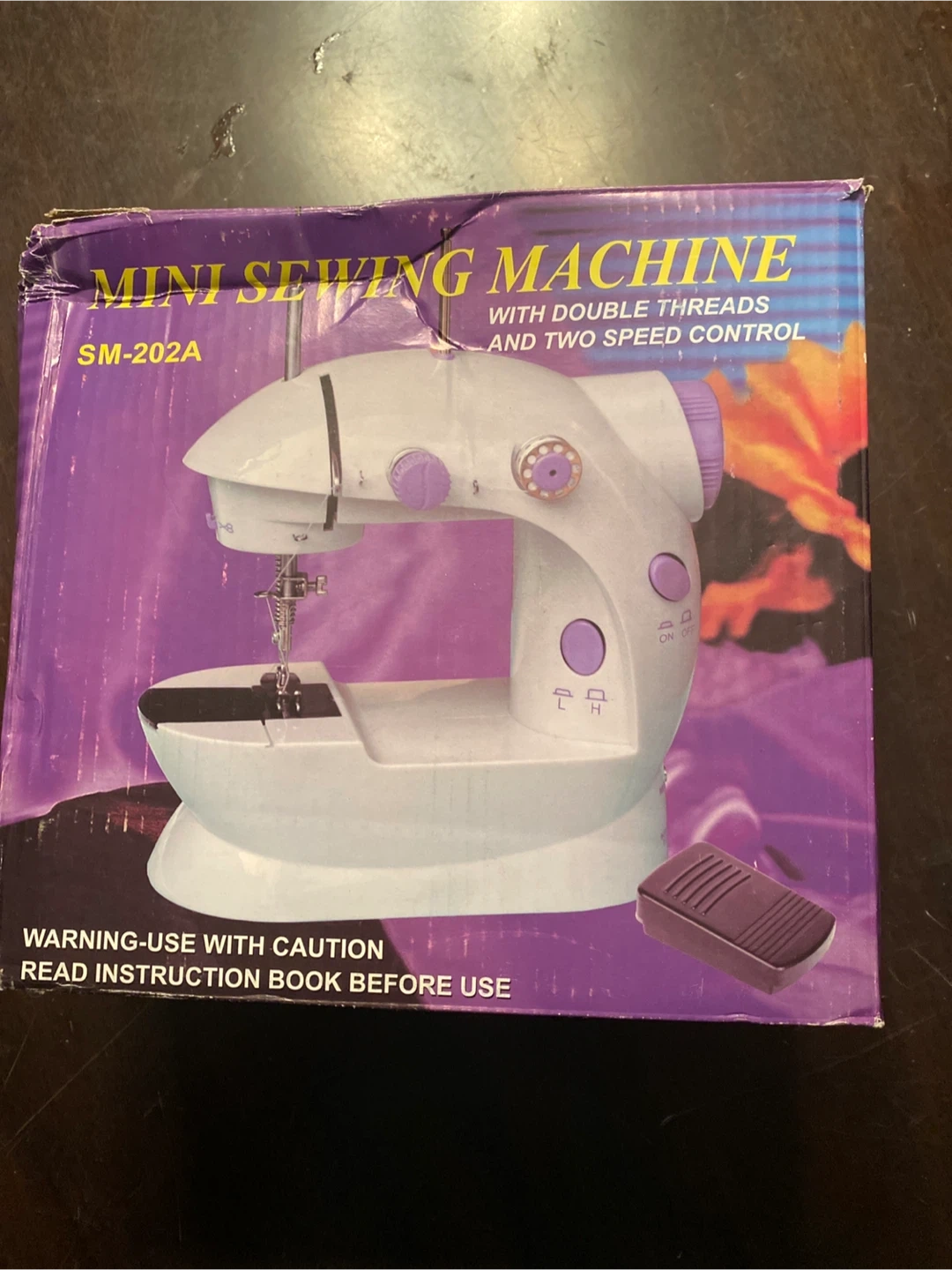 Selling a mini sewing machine, model SM-202A. It comes with double threads and two-speed control. Includes the instruction book. Perfect for small projects or beginners!