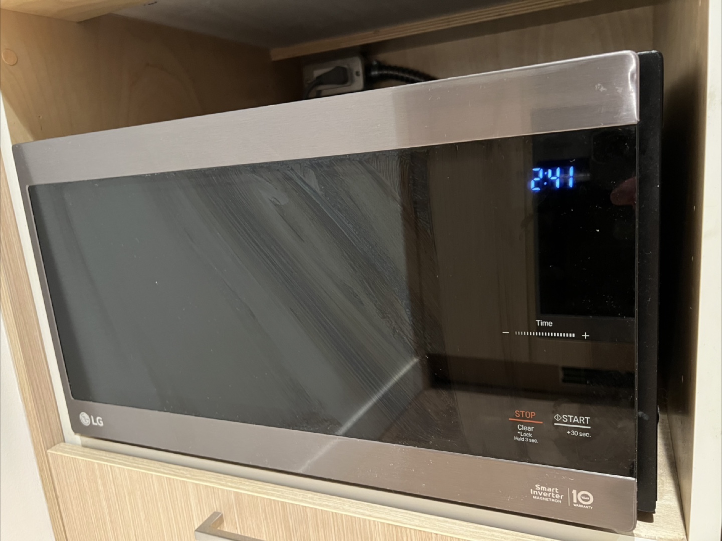 LG Microwave 54cm width. Plate is missing and it might need some repair. It’s still functional, but there is a smell coming out when used.