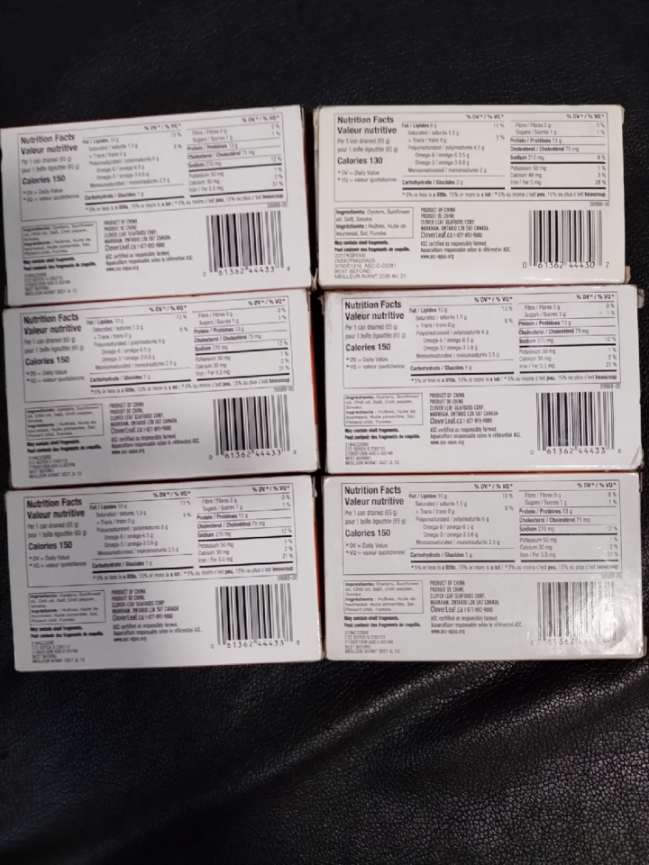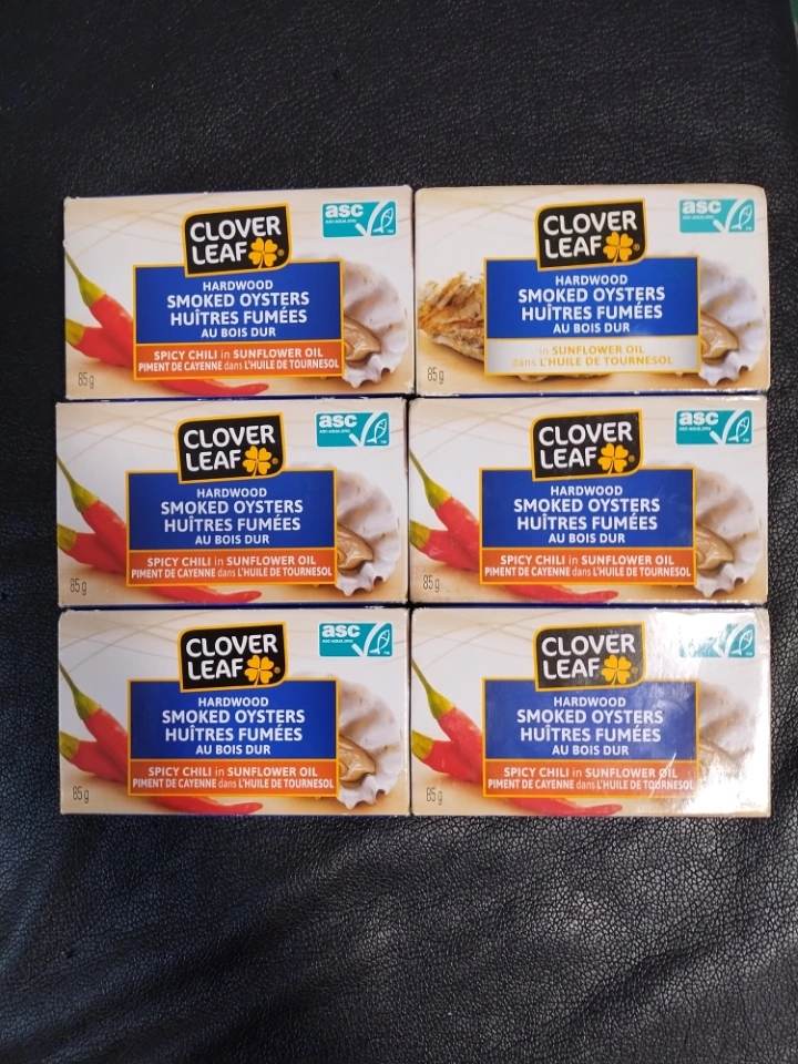 6 CANS CLOVER LEAF HARDWOOD SMOKED OYSTERS