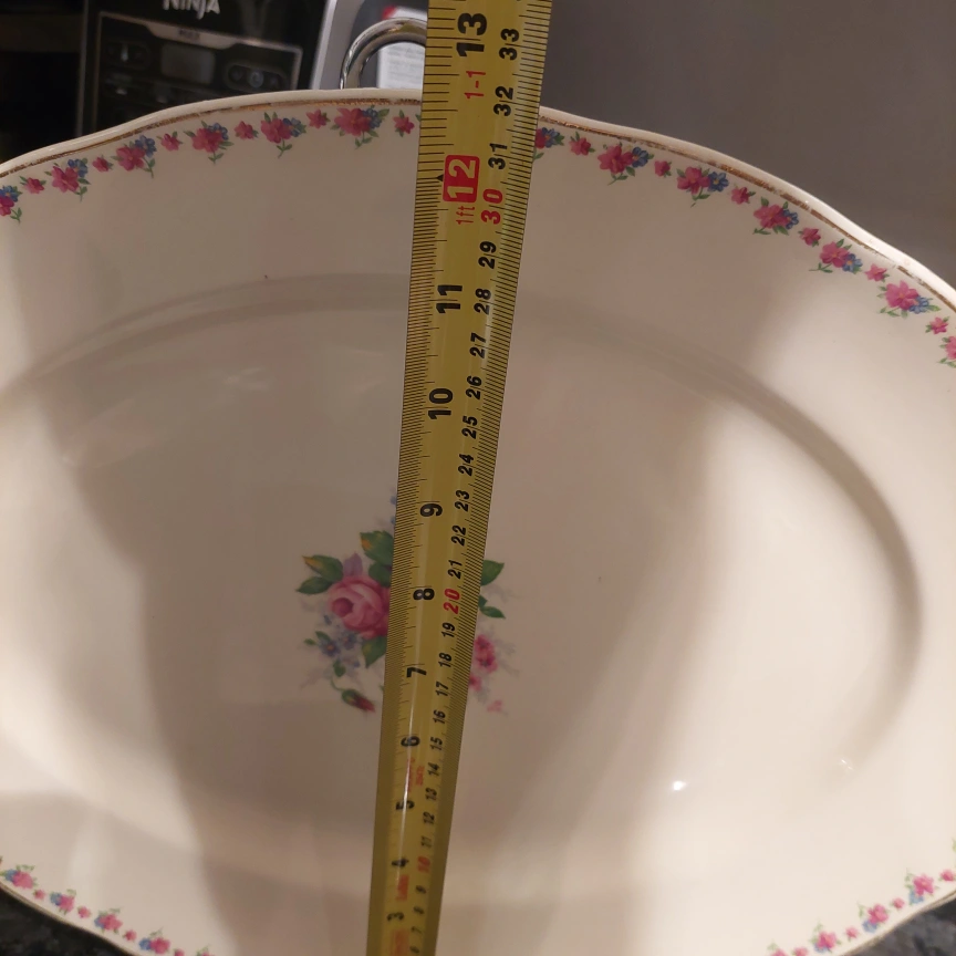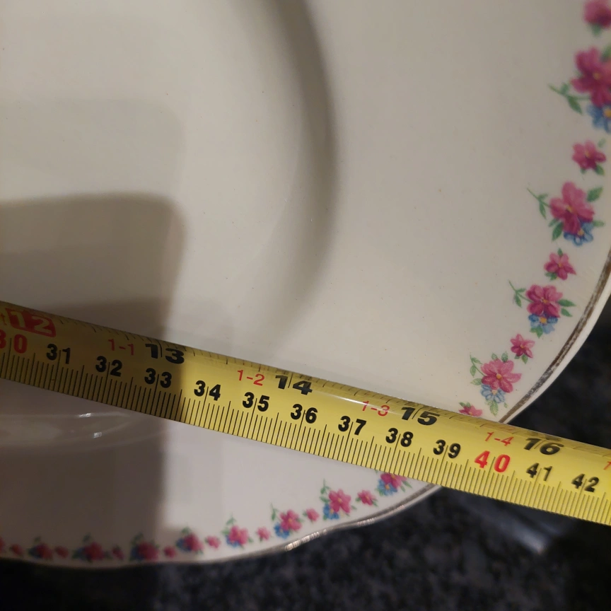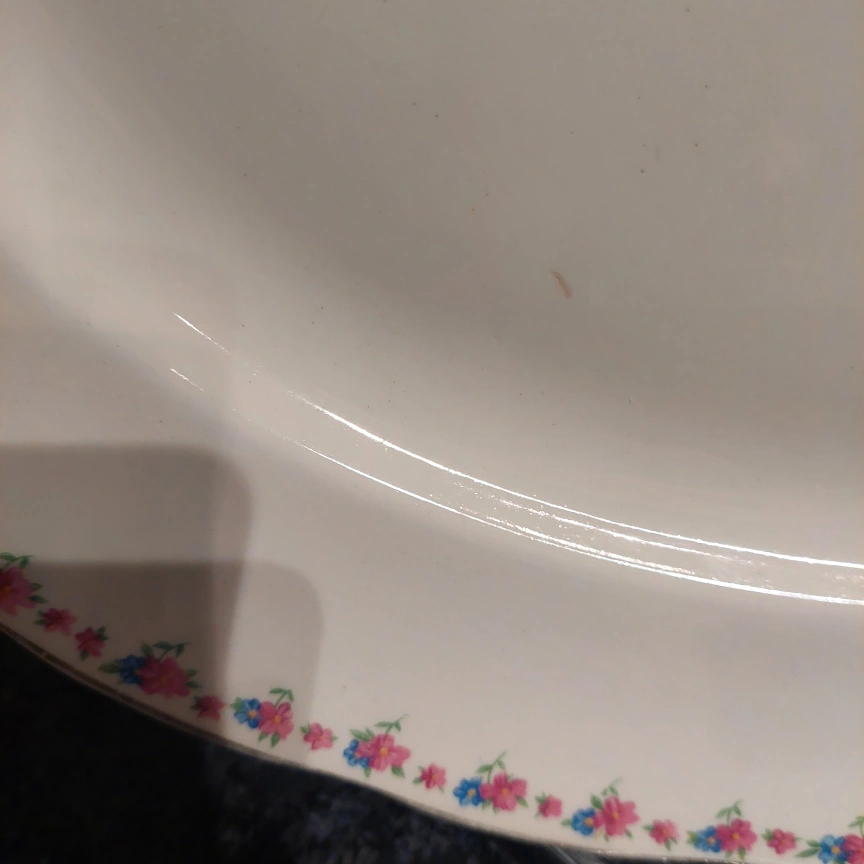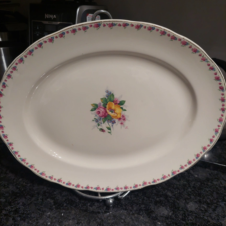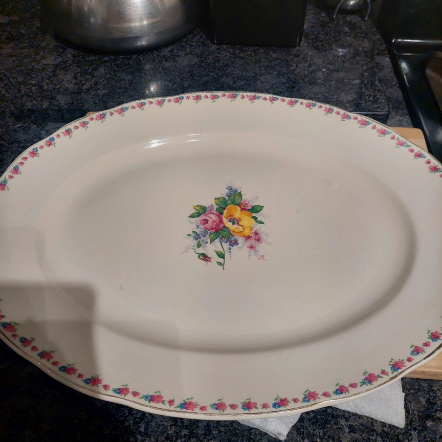 This lovely oval serving platter has a delicate floral pattern around the rim and a central floral bouquet. It measures approximately 17 inches in length and would be perfect for serving at gatherings or adding a touch of vintage charm to your table. Please take a look at my other items. Discount applies on multiple purchases. π€βΊοΈ