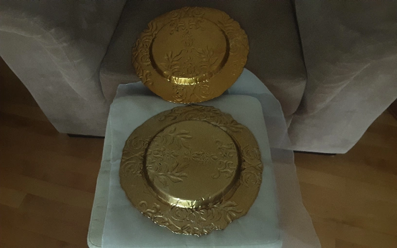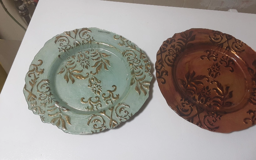 Selling two decorative charger plates. One is a light green/blue colour and the other is a copper/brown colour. Both have a gold floral design. They would look great as part of a table setting! hand made in turkey beautiful set