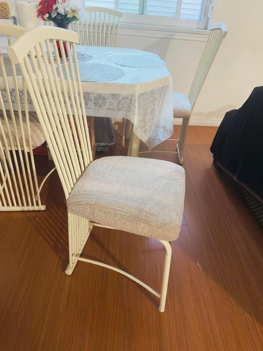 Selling a set of 6dining chairs. They're in great condition and would look lovely in any dining room! The chairs have a unique design and a comfortable seating.