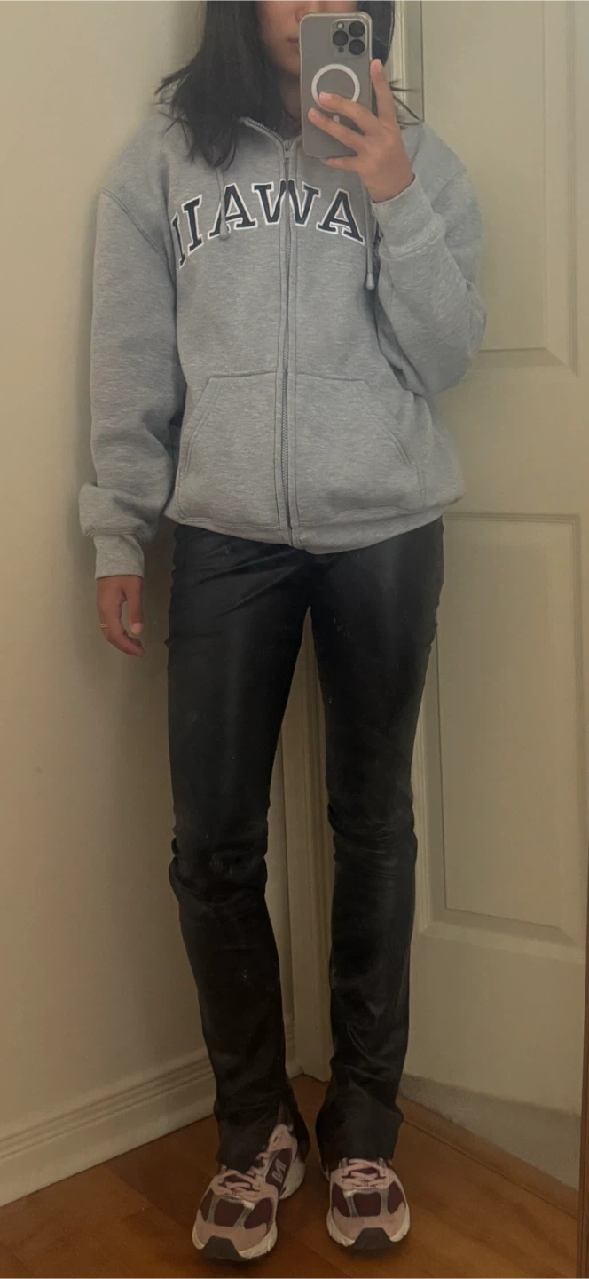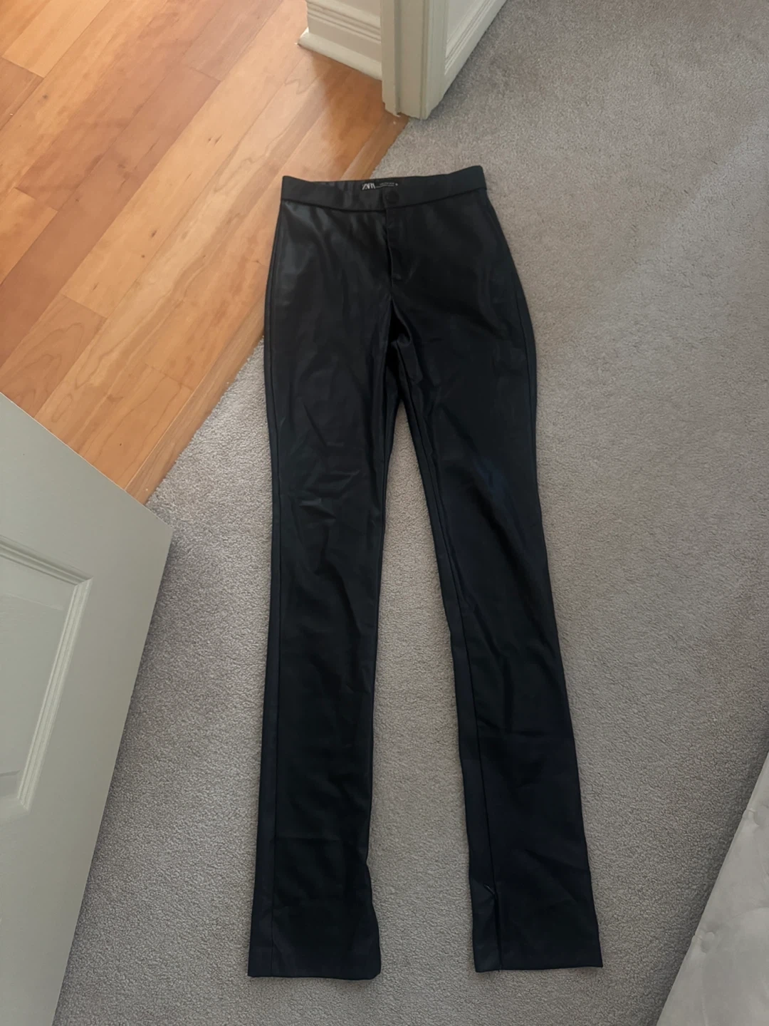 Selling a pair of Zara faux leather pants! They're a size small and have a stylish split hem detail at the bottom. Perfect for dressing up or down, and in great condition!