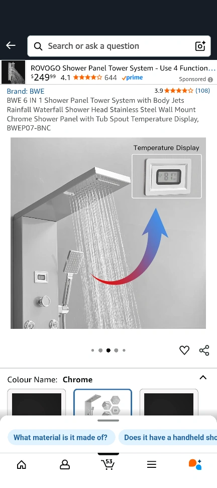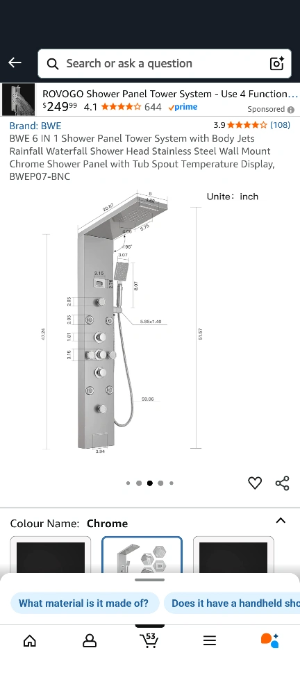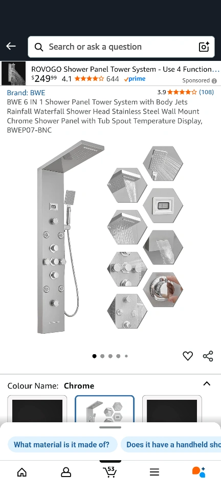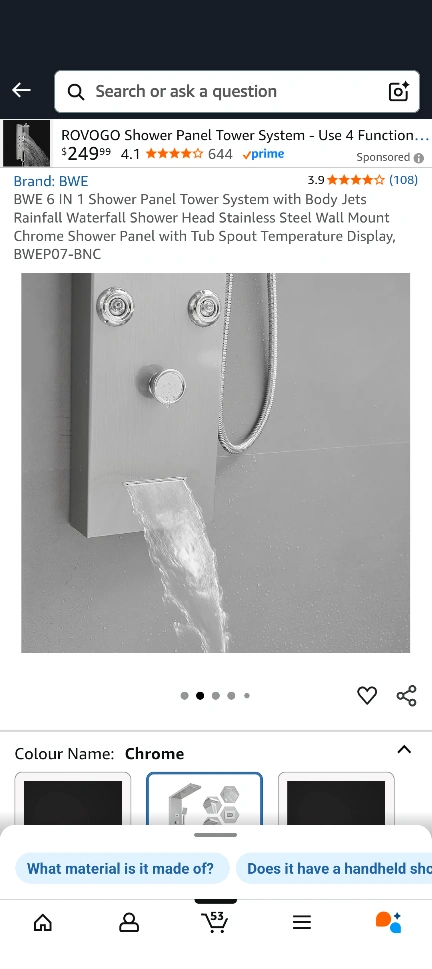 Looking to upgrade your shower? I'm selling a BWE 6-in-1 shower panel tower system. It features body jets, a rainfall waterfall shower head, and is made of stainless steel. It's designed for wall mounting and has a tub spout with temperature display. The model number is BWEP07-BNC.