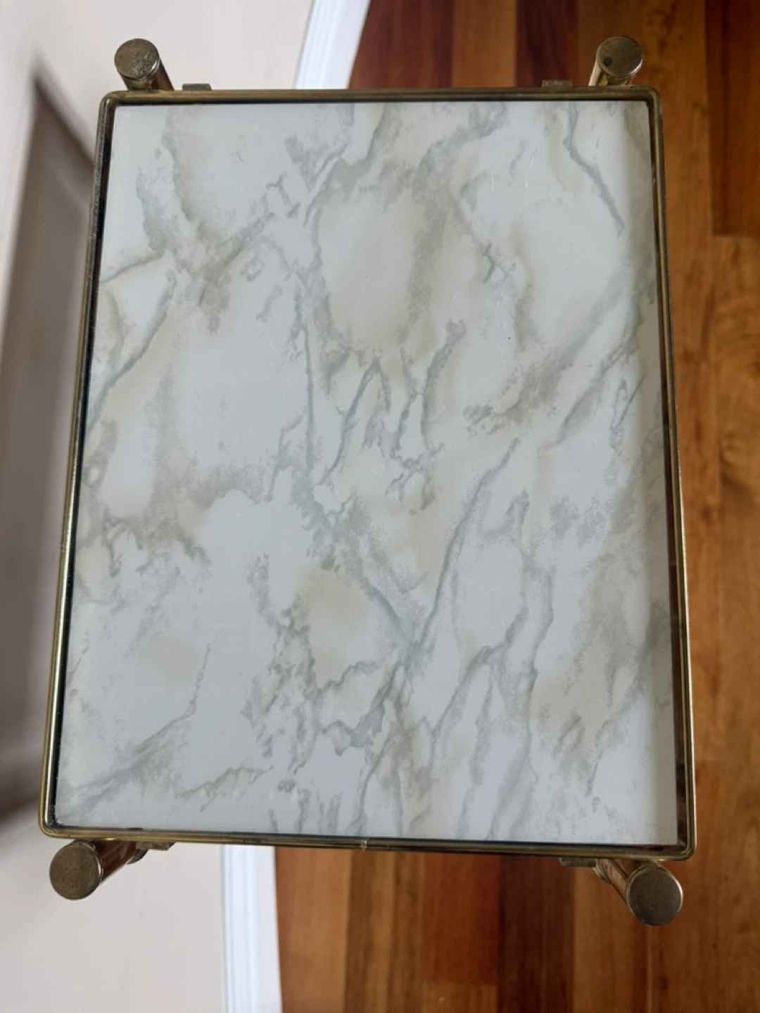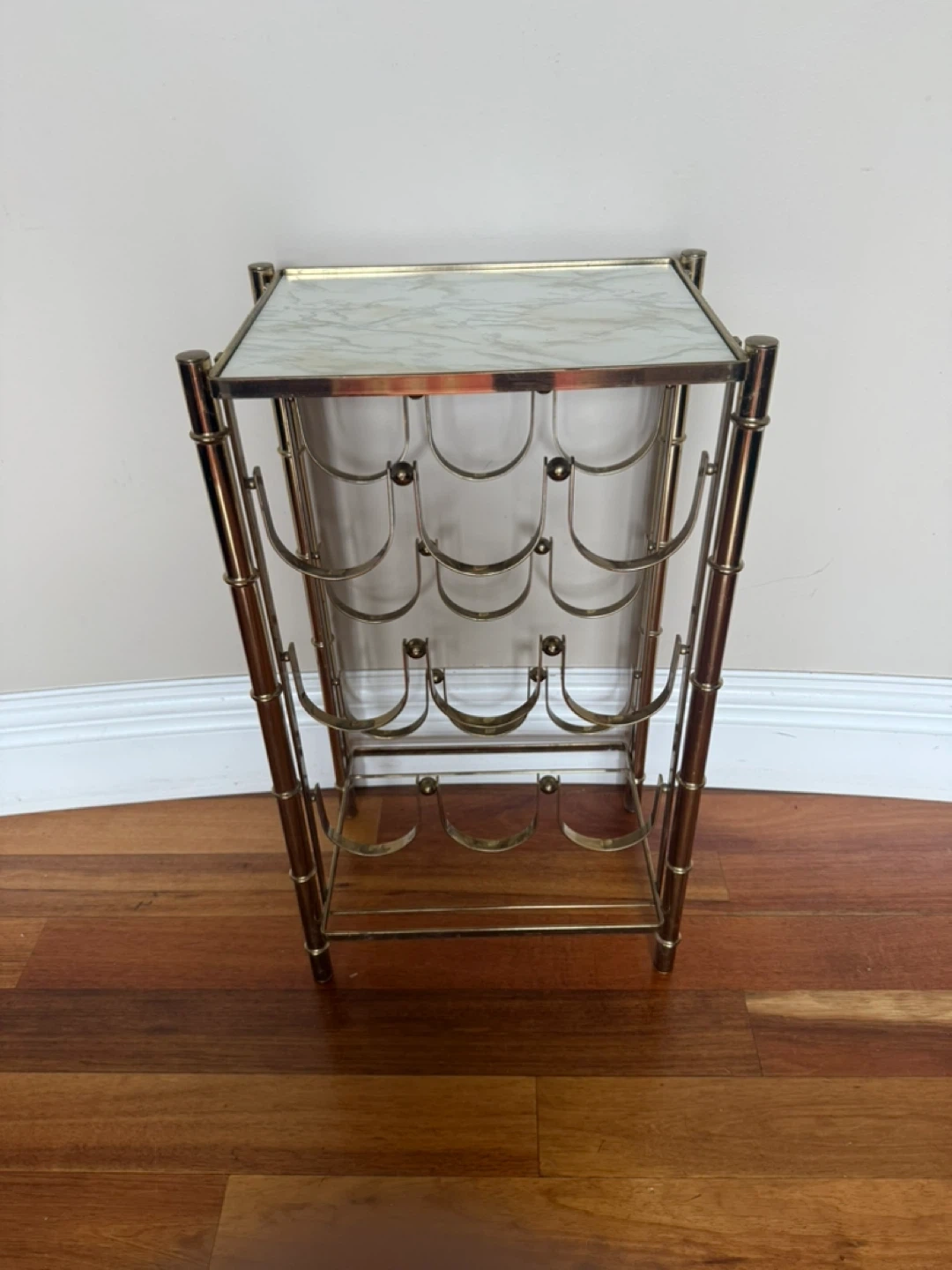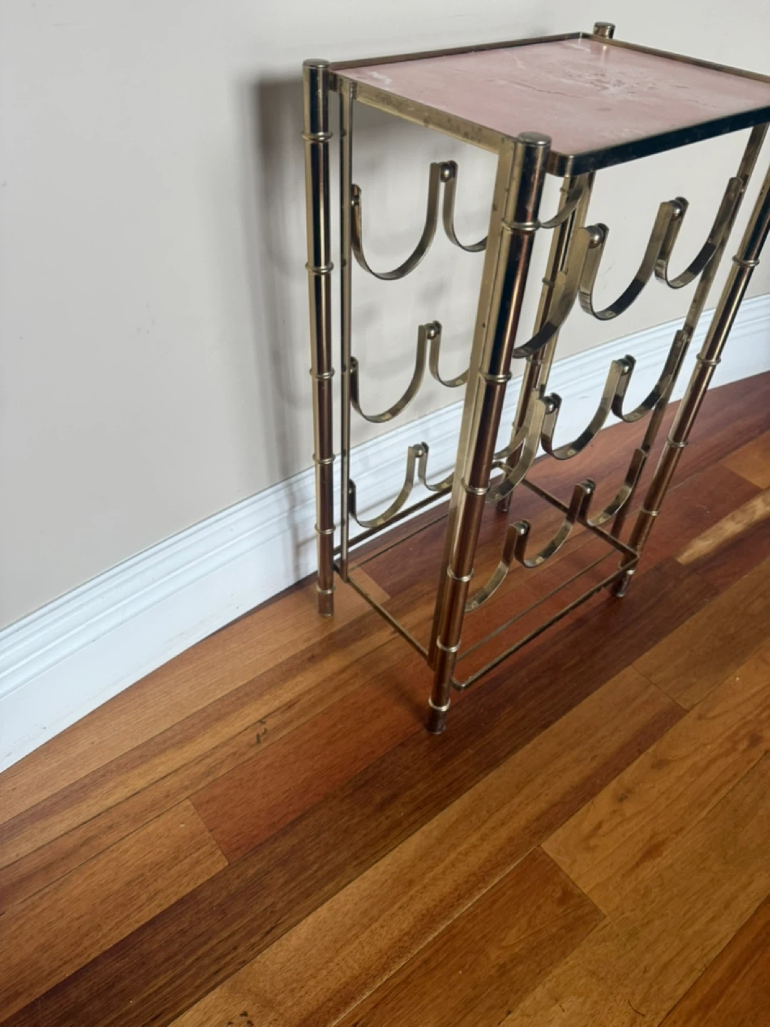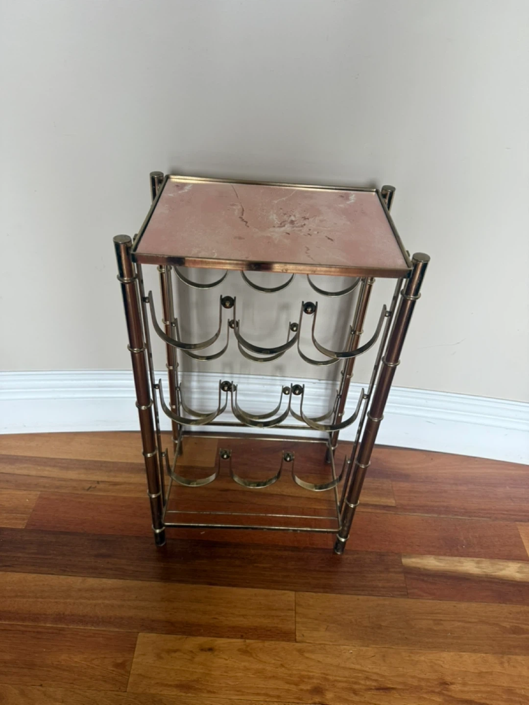 75Selling a stylish brass-style metal wine rack, perfect for displaying your favourite bottles! The top is glass covered with faux marble paper on one side and pink on the other. Can easily be removed to expose the glass. Please see photos for size & condition. Cash and pick up only in W. Hillhurst NW. Thanks for looking!