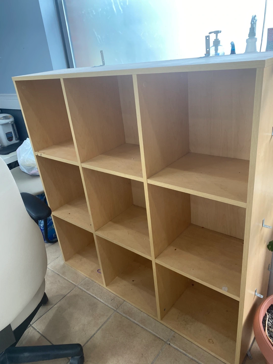 81Selling a cube storage shelf in a light wood finish. It has a 3x4 configuration, perfect for organizing books, toys, or other items. It's in good condition and ready for a new home Need gone asap