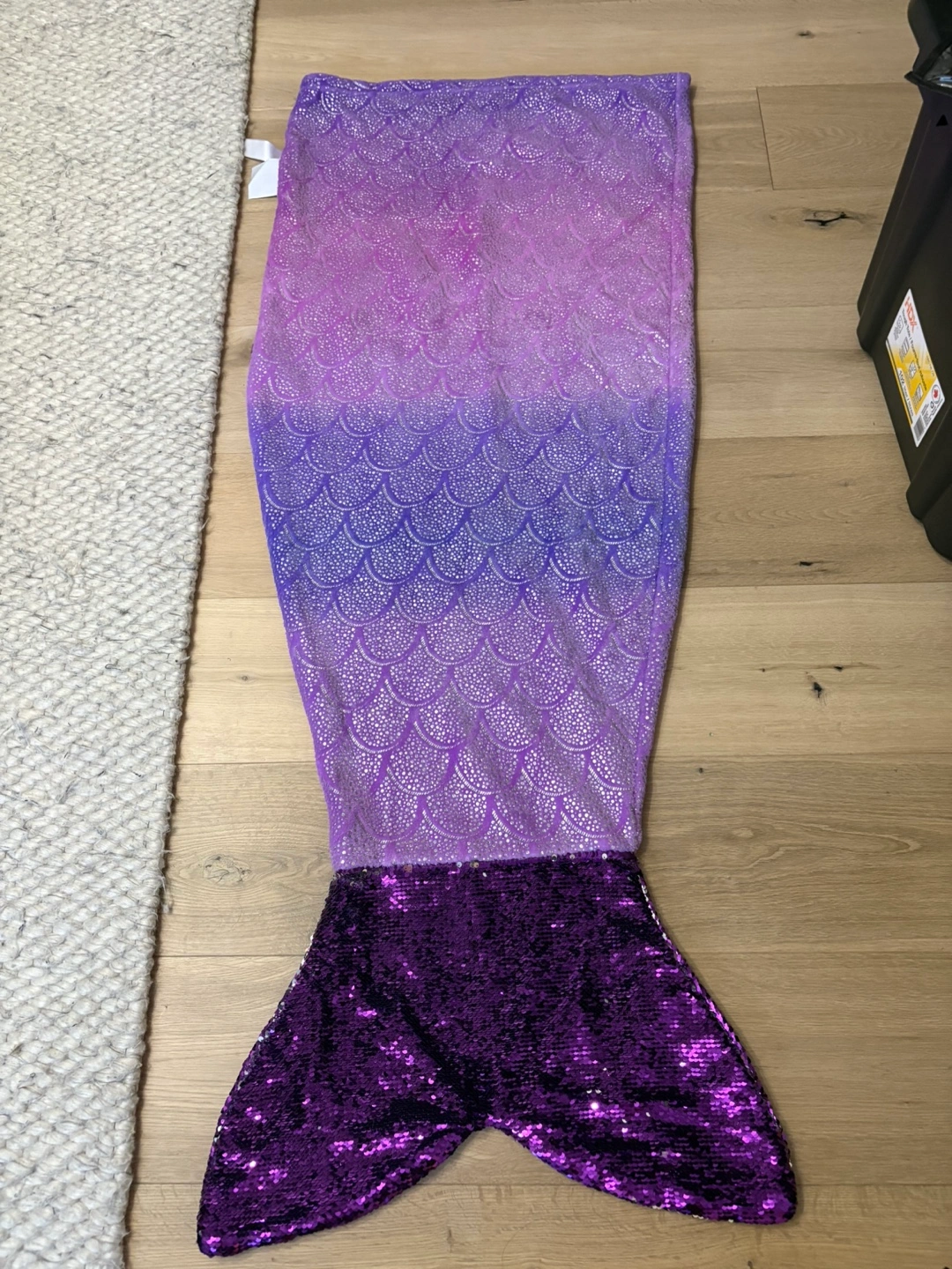Snuggle up in this fun mermaid tail blanket! It's a vibrant purple colour with a sparkly sequin tail. Perfect for cozy nights or imaginative play