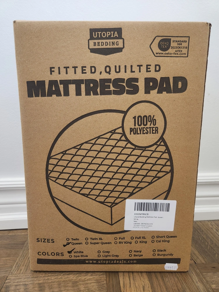 I'm selling a Utopia Bedding Fitted, Quilted Mattress Pad in queen size. It's made of 100% polyester and comes in its original box.