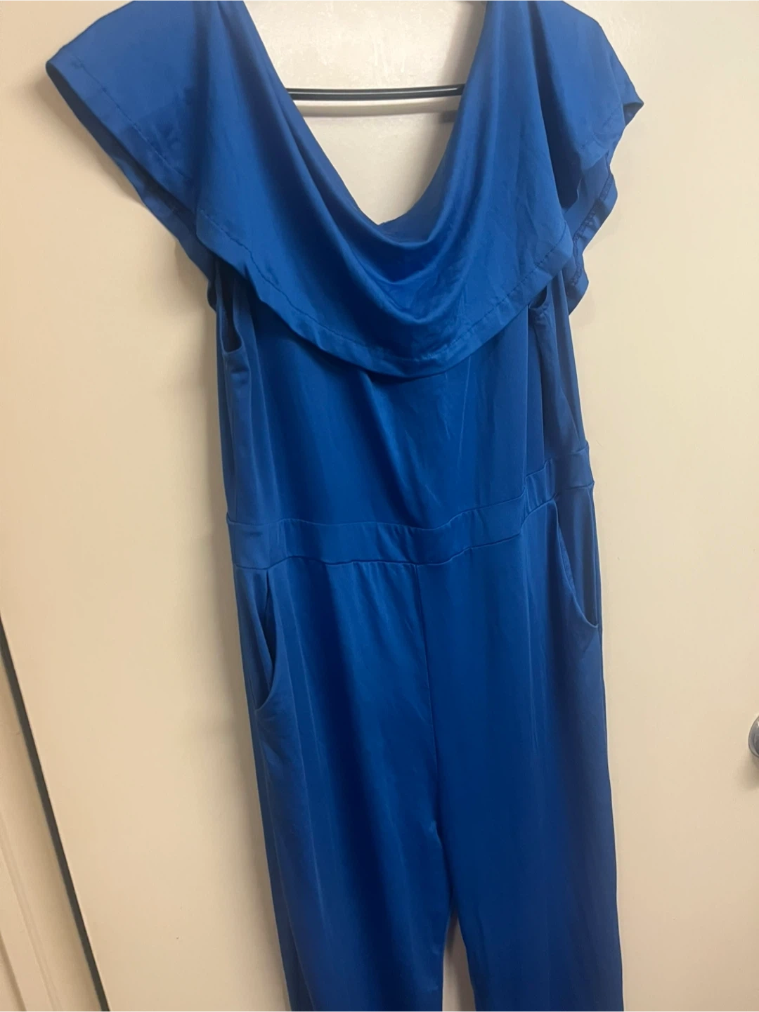 A vibrant blue jumpsuit, perfect for a stylish and comfortable look! Can be worn off the shoulders or on the shoulders.