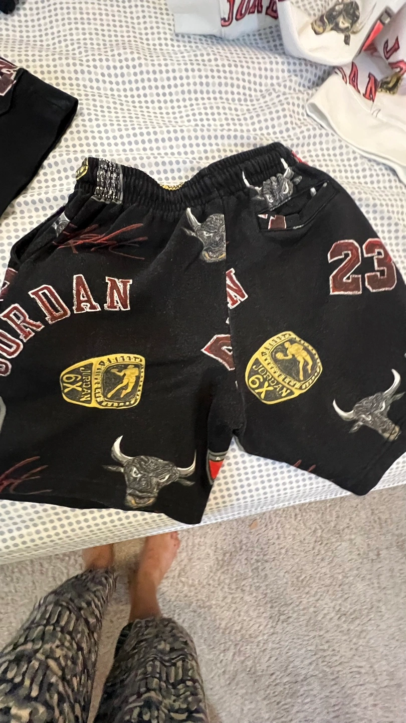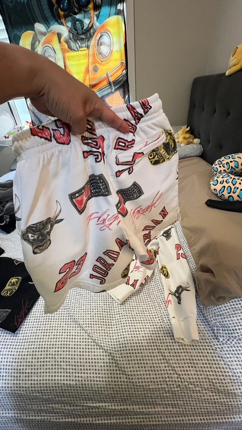 Selling a Jordan Flight 23 hoodie and shorts set. The set features a repeating pattern of the number 23, the word "Jordan", and the Chicago Bulls logo. Available in both black and white. Each set 75