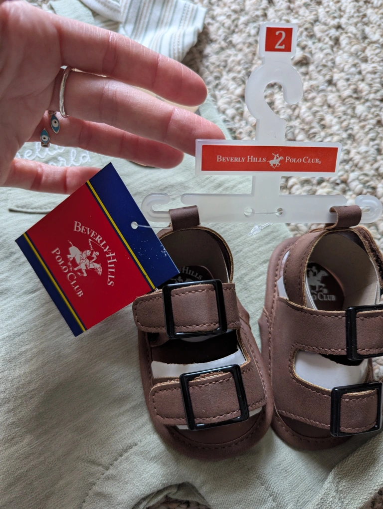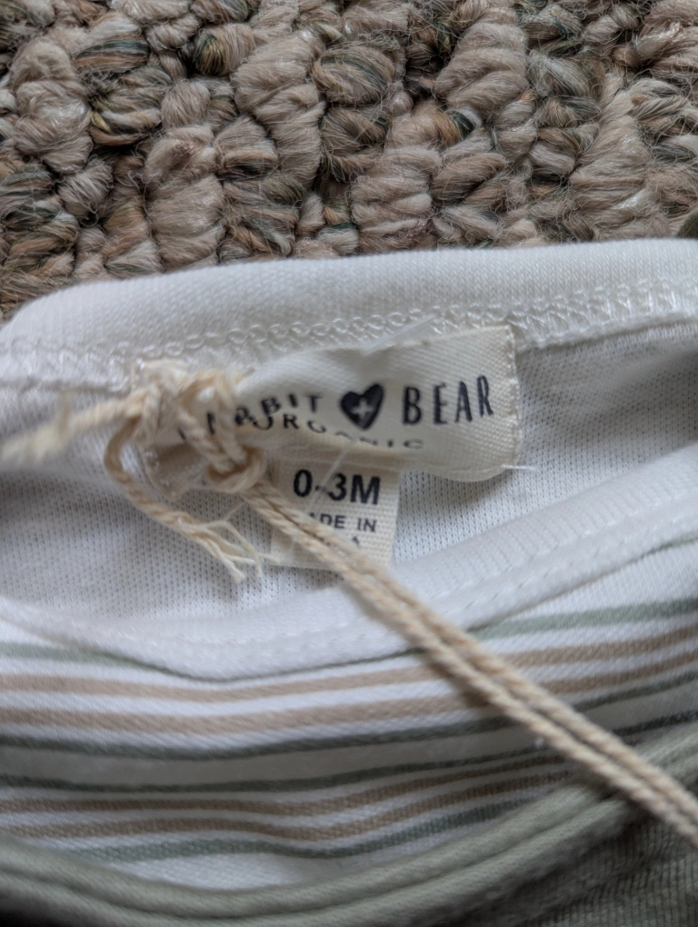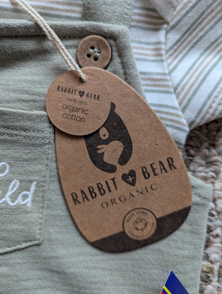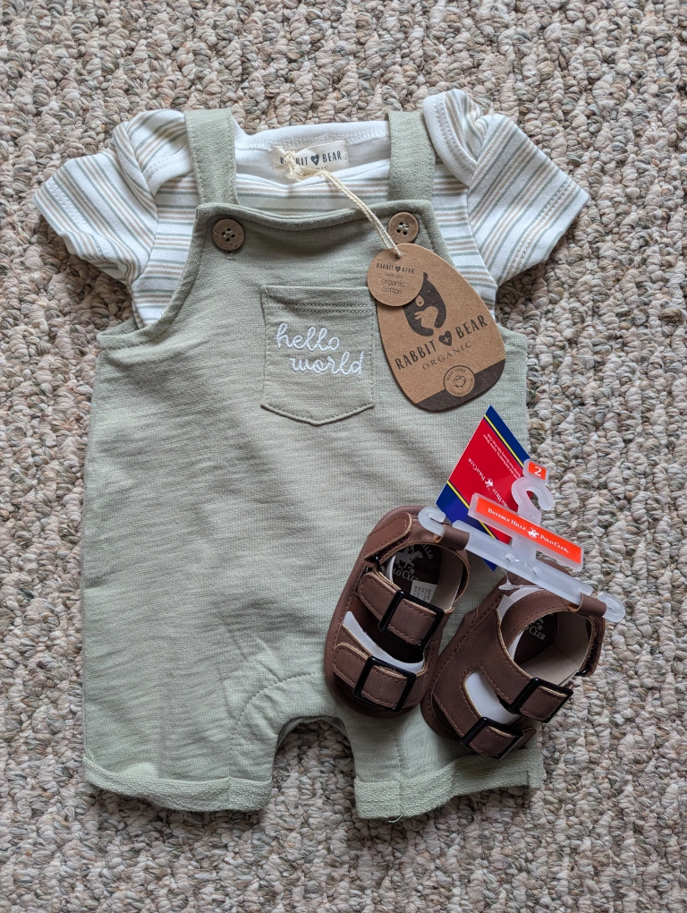 20This adorable outfit includes a Rabbit Bear Organic top and overalls, size 0-3M, plus a pair of Beverly Hills Polo Club sandals, size 2. All items are brand new with tags!