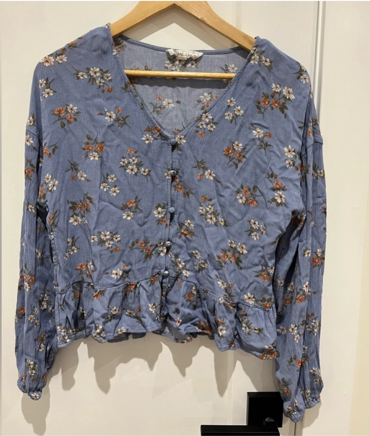 Wild Skye Blue Blouse w/ Florals Styled well tucked into pants/trousers or tied at the waist with a belt. 100% rayon Size Medium Only worn a few times, still is great condition Smoke Free Home π