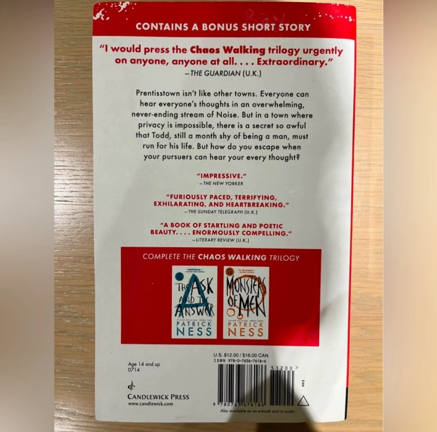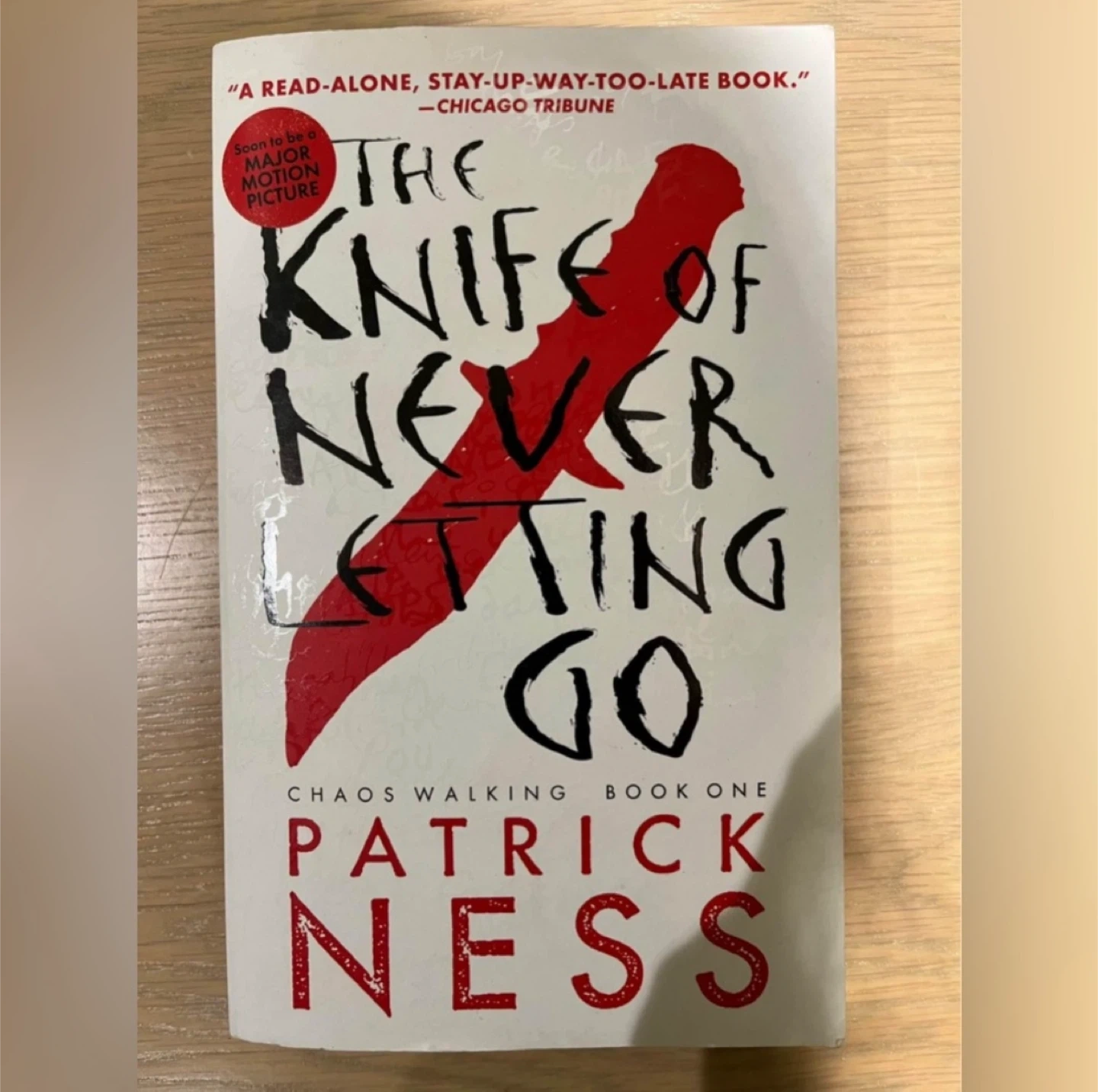 THE KNIFE OF NEVER LETTING GO by Patrick Ness Used - Good Bundle any 5/$10 📚 Smoke Free Home 🚠"Todd Hewitt is the only boy in a town of men. Ever since the settlers were infected with the Noise germ, Todd can hear everything the men think, and they hear everything he thinks. In the midst of the cacophony, Todd knows that the town is hiding something from him: something so awful he is forced to flee. With hostile men from the town in pursuit, Todd stumbles upon a strange and eerily silent creature: a girl. Who is she? Why wasn’t she killed by the germ like all the females on New World? Propelled by Todd’s gritty narration, readers are in for a white-knuckle journey in which a boy on the cusp of manhood must unlearn everything he knows in order to figure out who he truly is."
