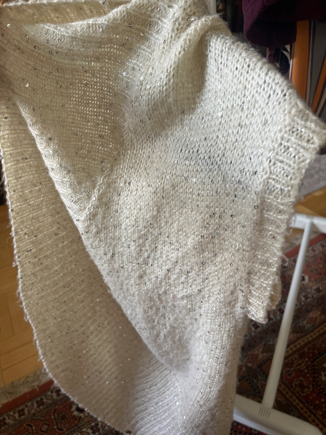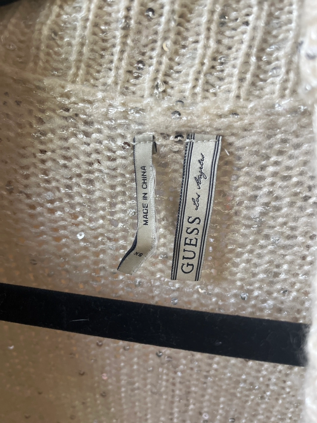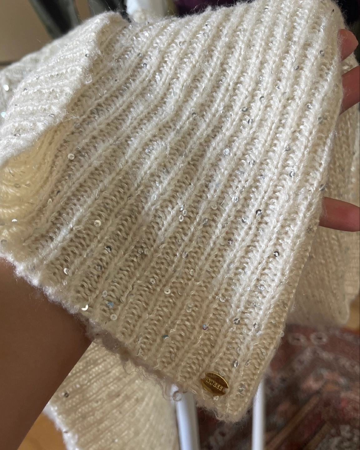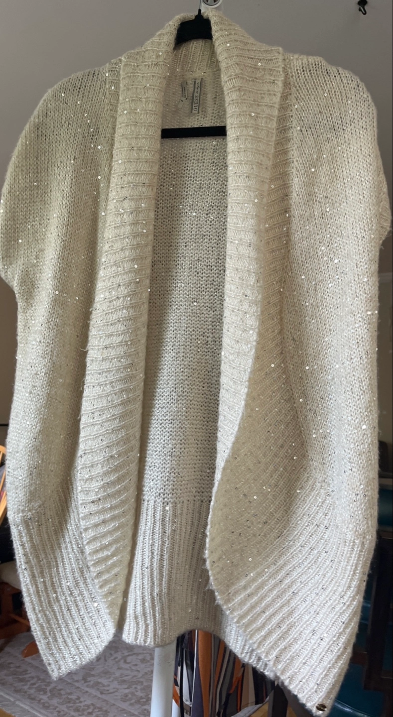 Cozy cream-coloured knit cardigan from Guess. It's in great condition and features subtle sparkly details throughout. Perfect for layering!