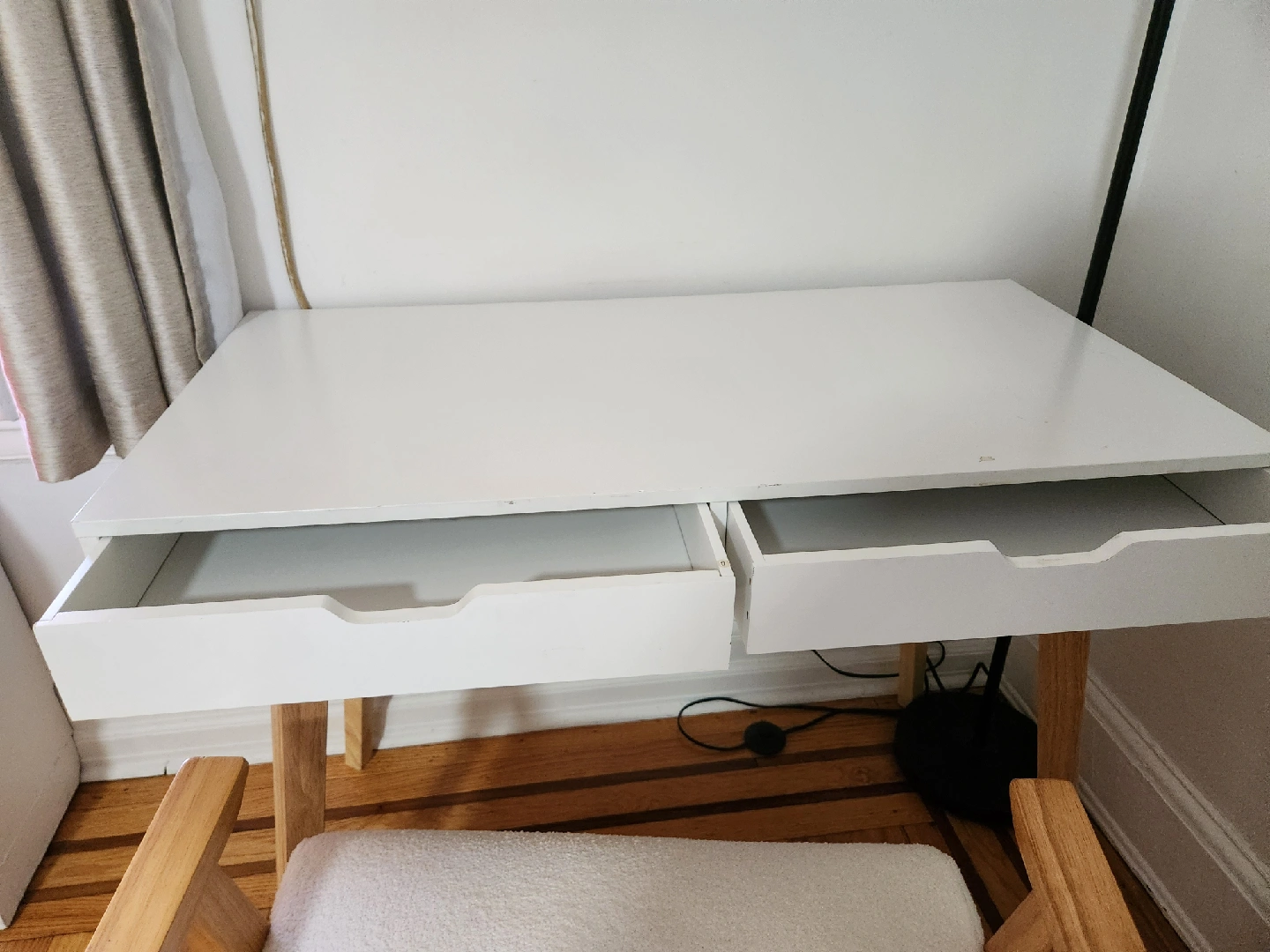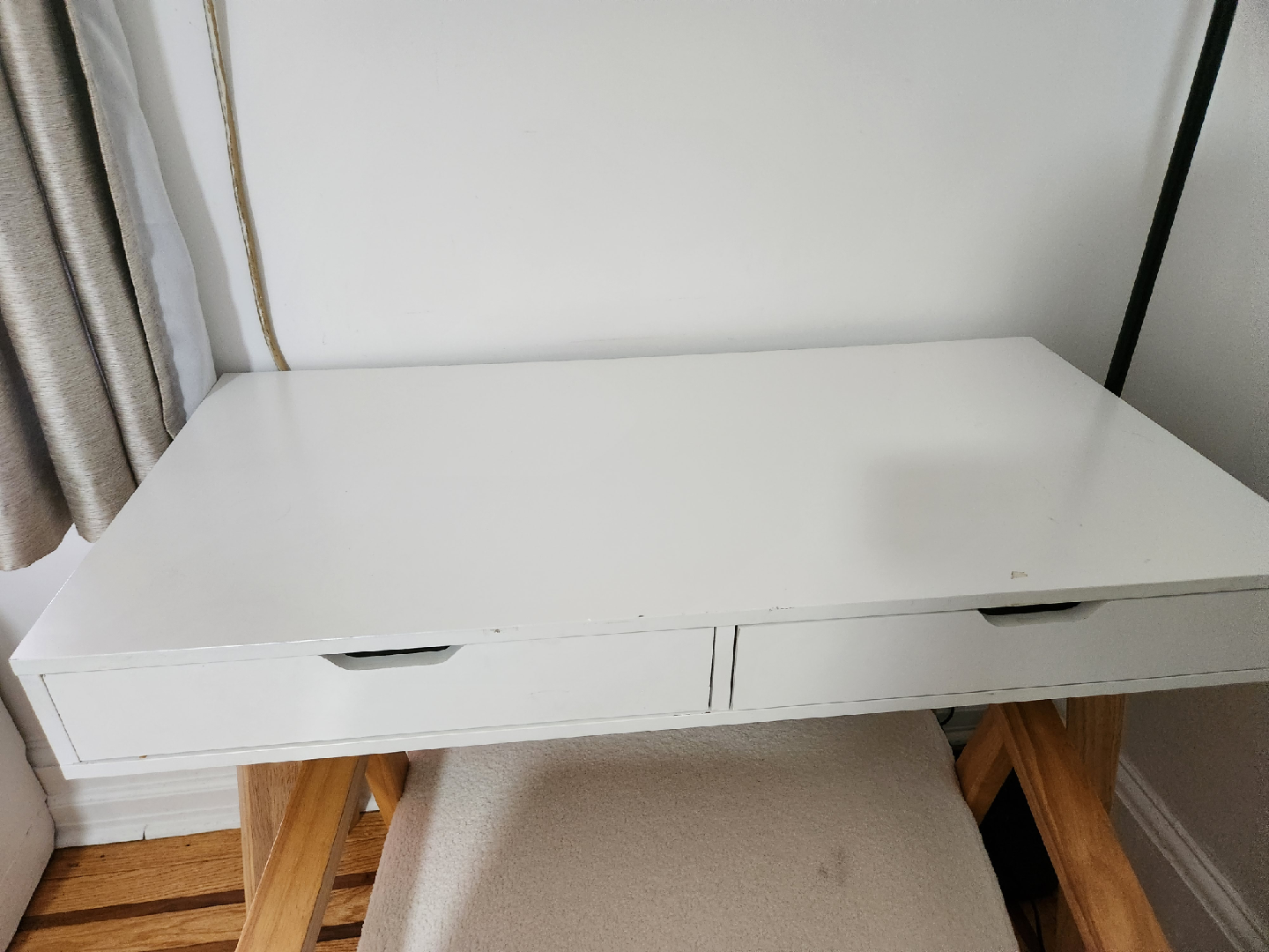 Selling a simple white desk with two drawers. It's perfect for a small workspace or as a vanity. The desk is in good condition and ready for a new home! It's a clean and functional piece of furniture.