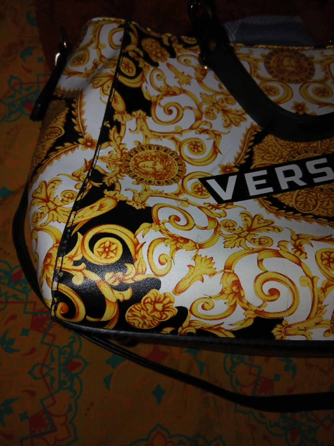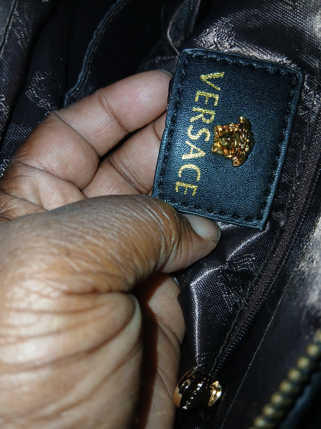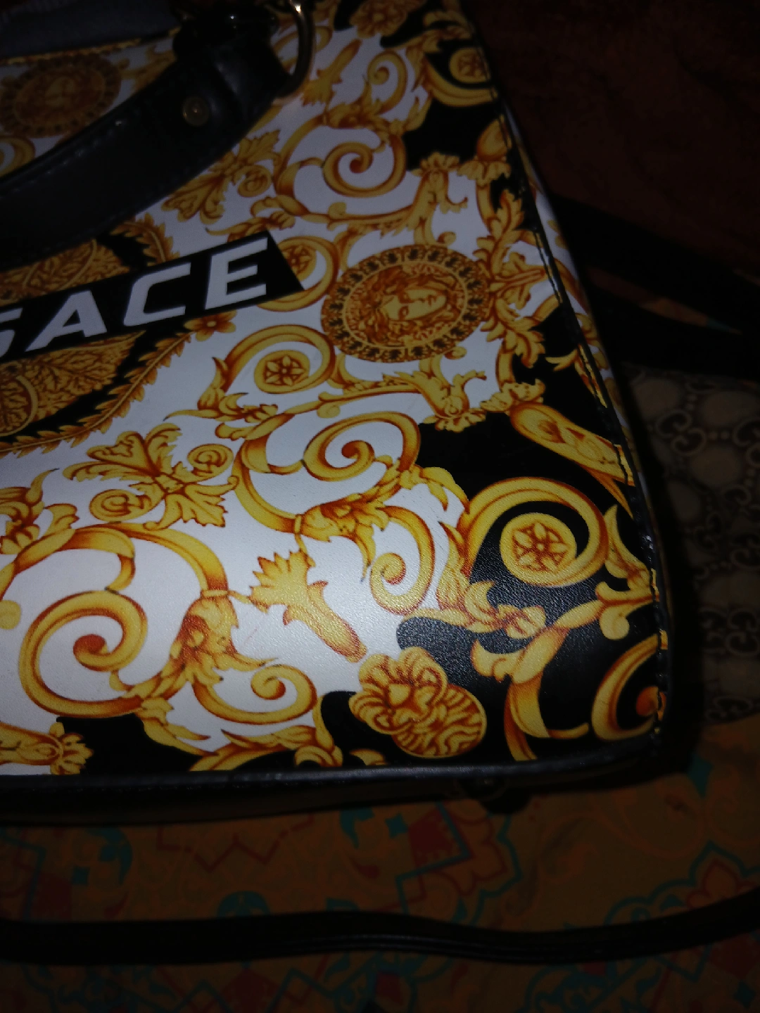 Versace handbag with gold and black accents. It has a unique design and is in good condition