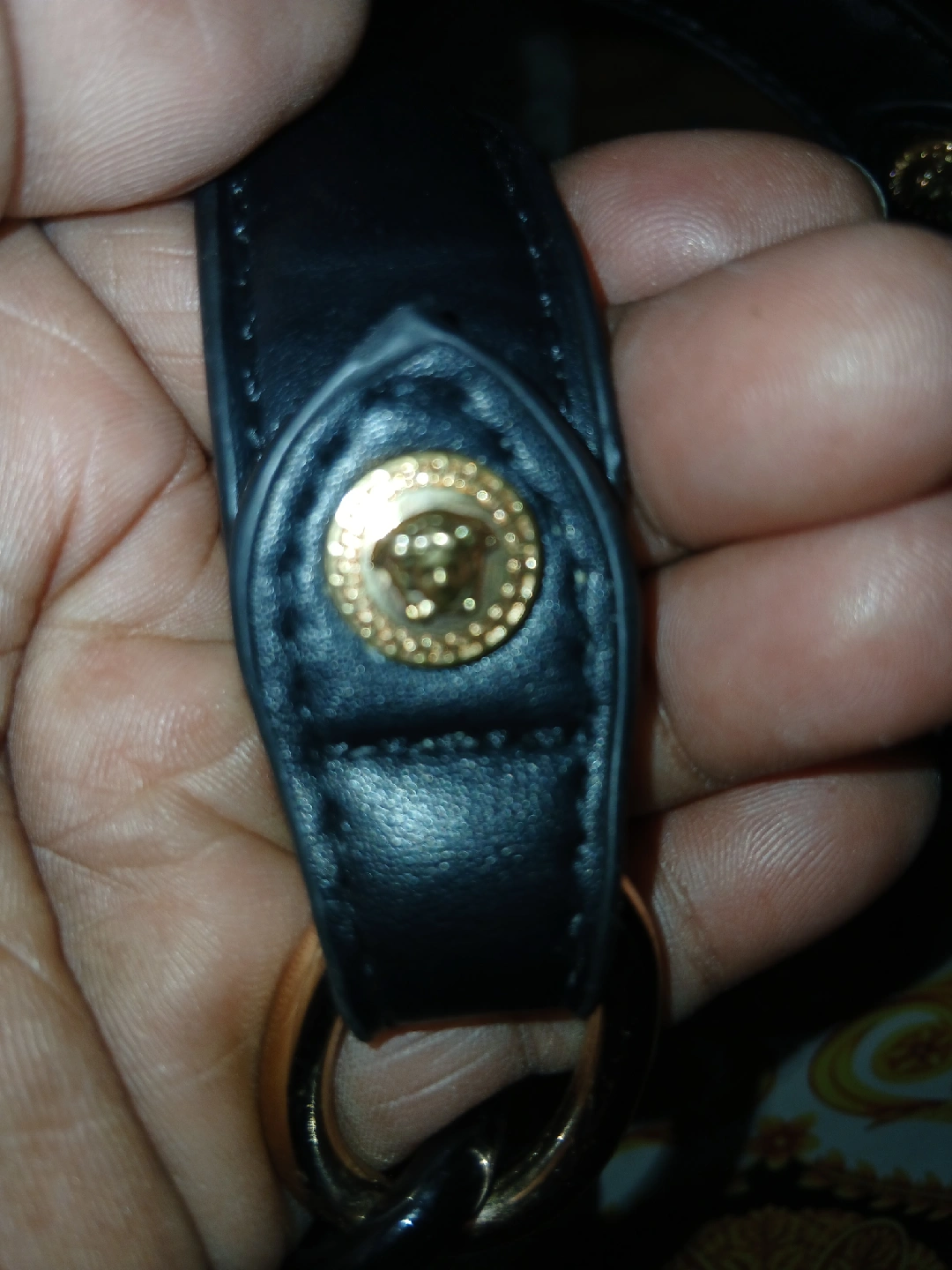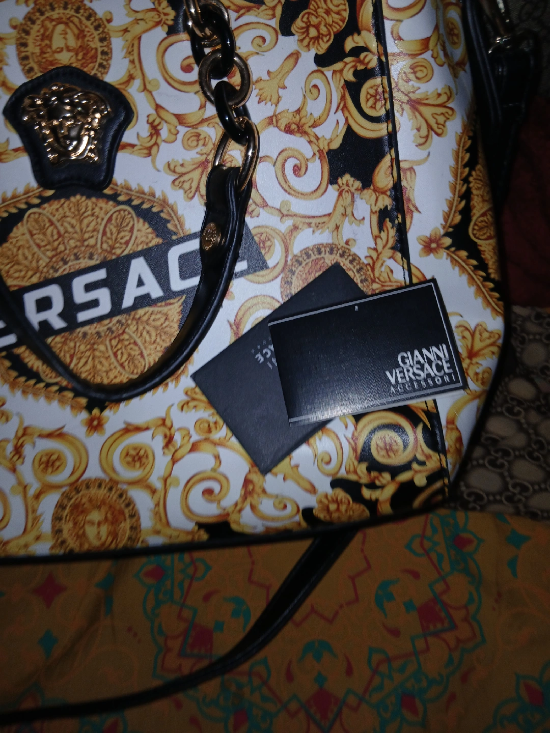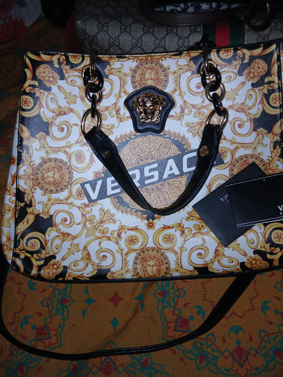 Versace handbag with gold and black accents. It has a unique design and is in good condition