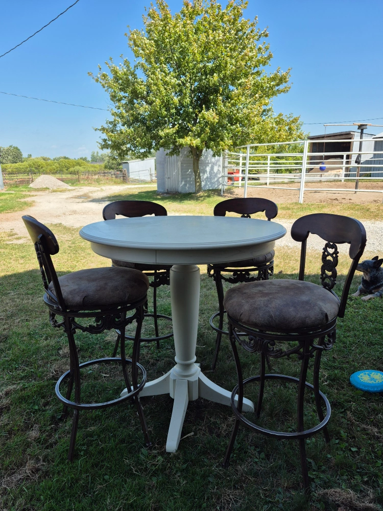 Selling a pub table with four matching bar stools. The table has a white base and a light-colored top. The stools are brown with decorative metal frames. Great for a kitchen or rec room! Could use a touchup paint job.