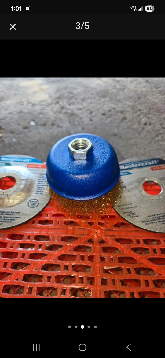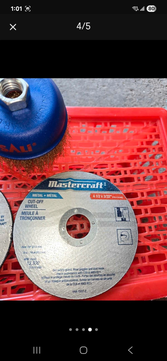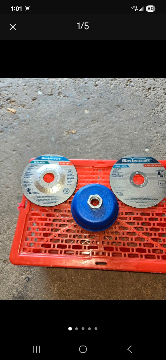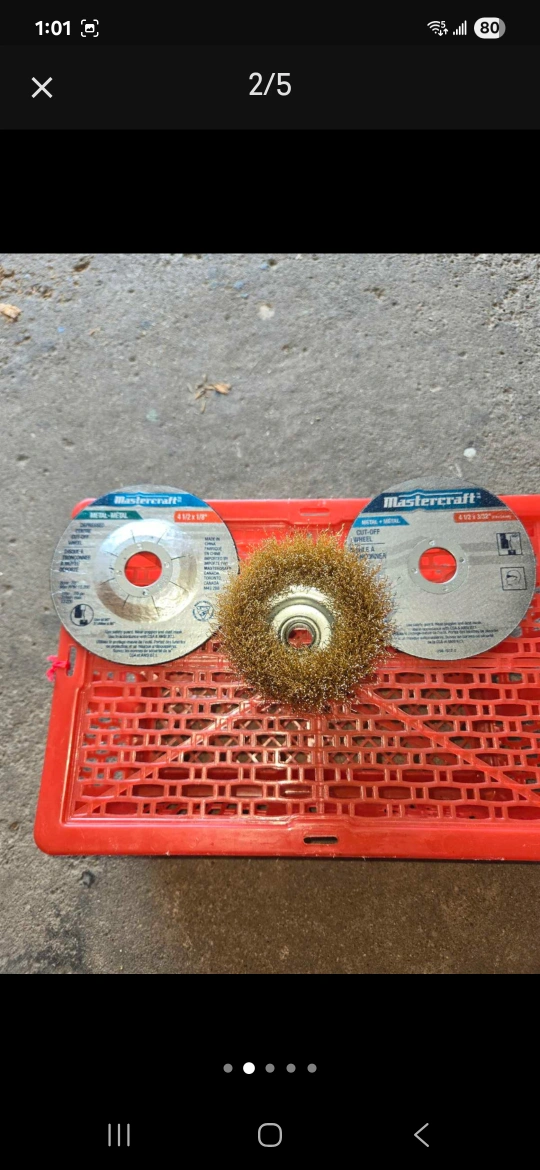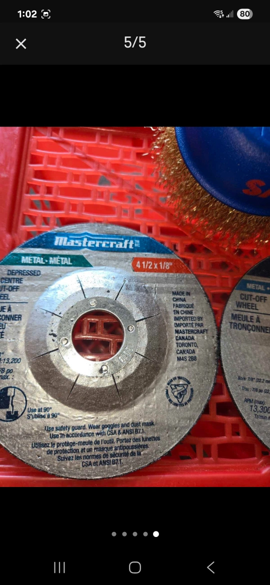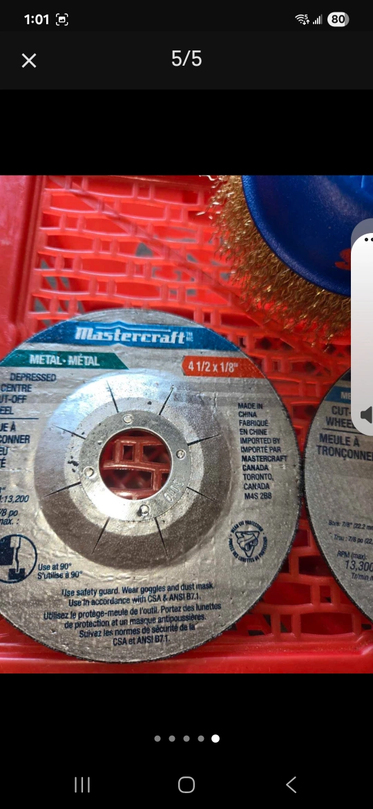 Selling a set of Mastercraft metal cut-off wheels and a wire brush. The cut-off wheels are 4 1/2 x 1/8 inches. Great for various metalworking projects! 3pc for $5 only