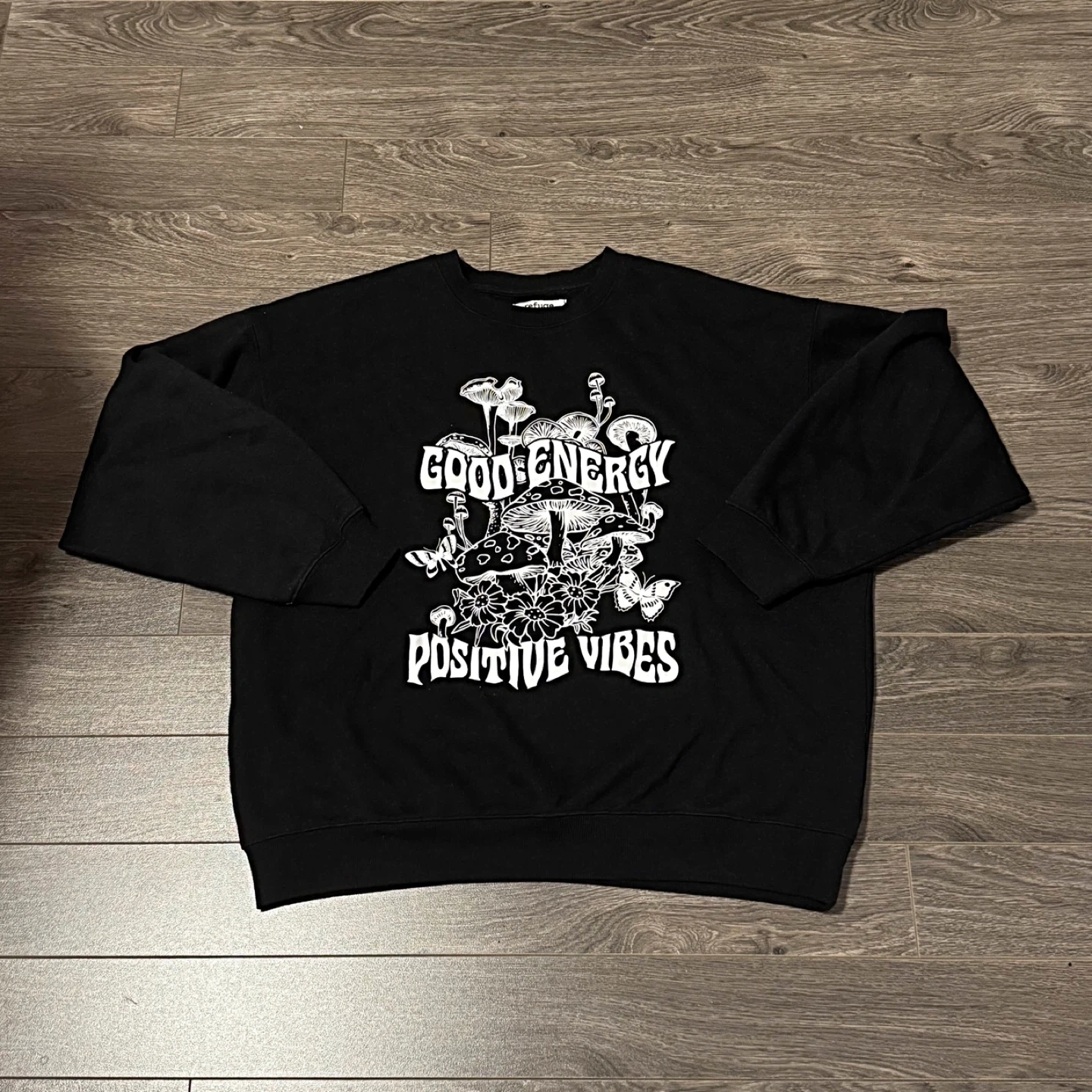Selling a comfy black sweatshirt from Refuge! It has a cute design with mushrooms, flowers, and butterflies, along with the words 'Good Energy' and 'Positive Vibes'. It's in great condition and perfect for cozy days! Size - Medium. CASH ONLY PICK UP ONLY