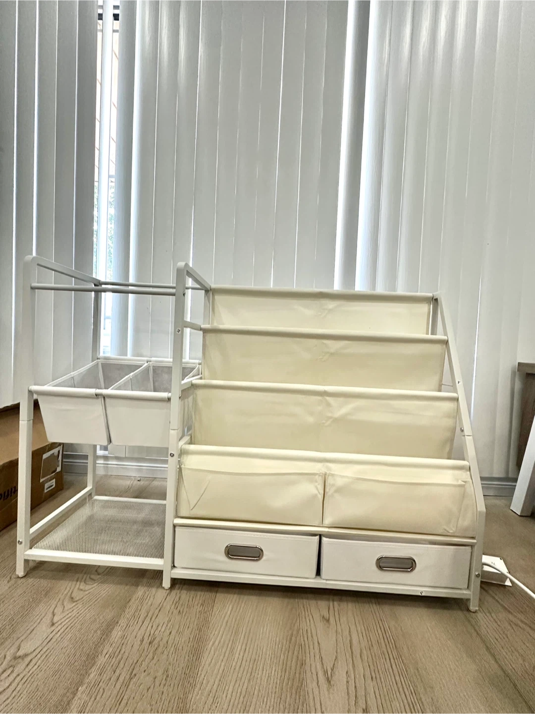 Looking to sell this cover-forward bookshelf! It's great for displaying books and keeping them organized. The bookshelf has a white frame with fabric shelves and drawers at the bottom. Perfect for a kids' room or playroom