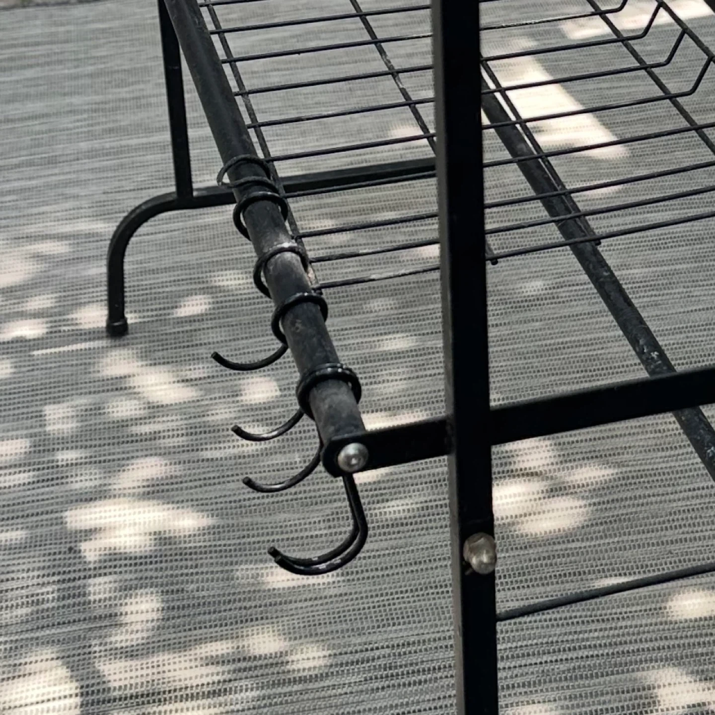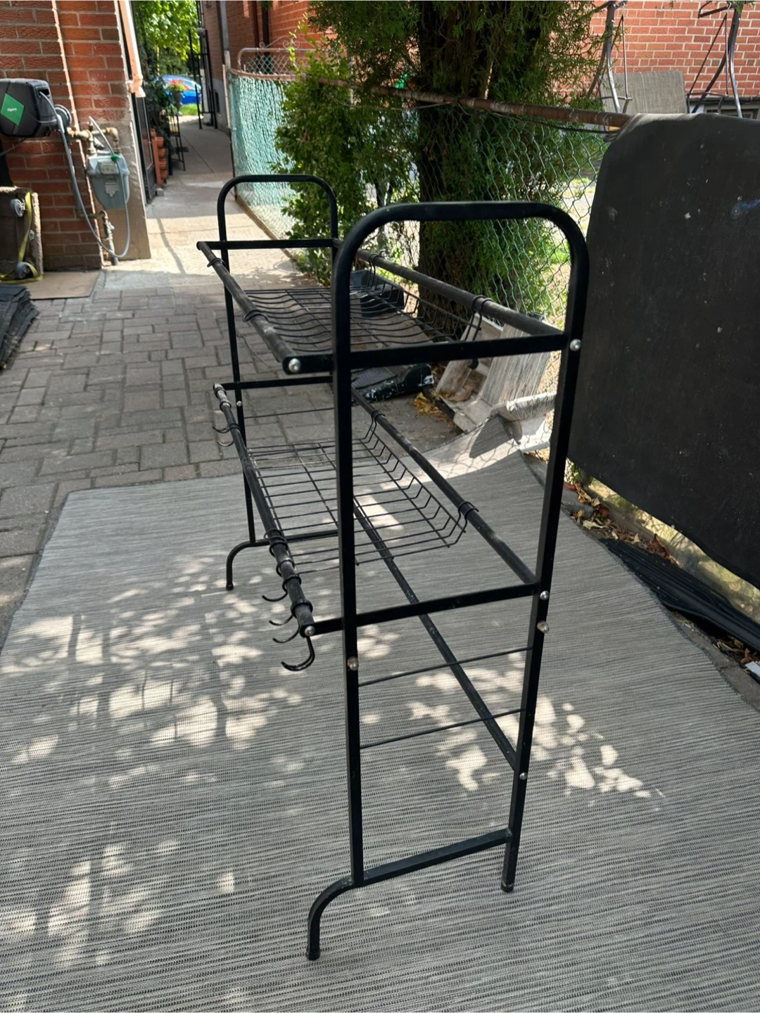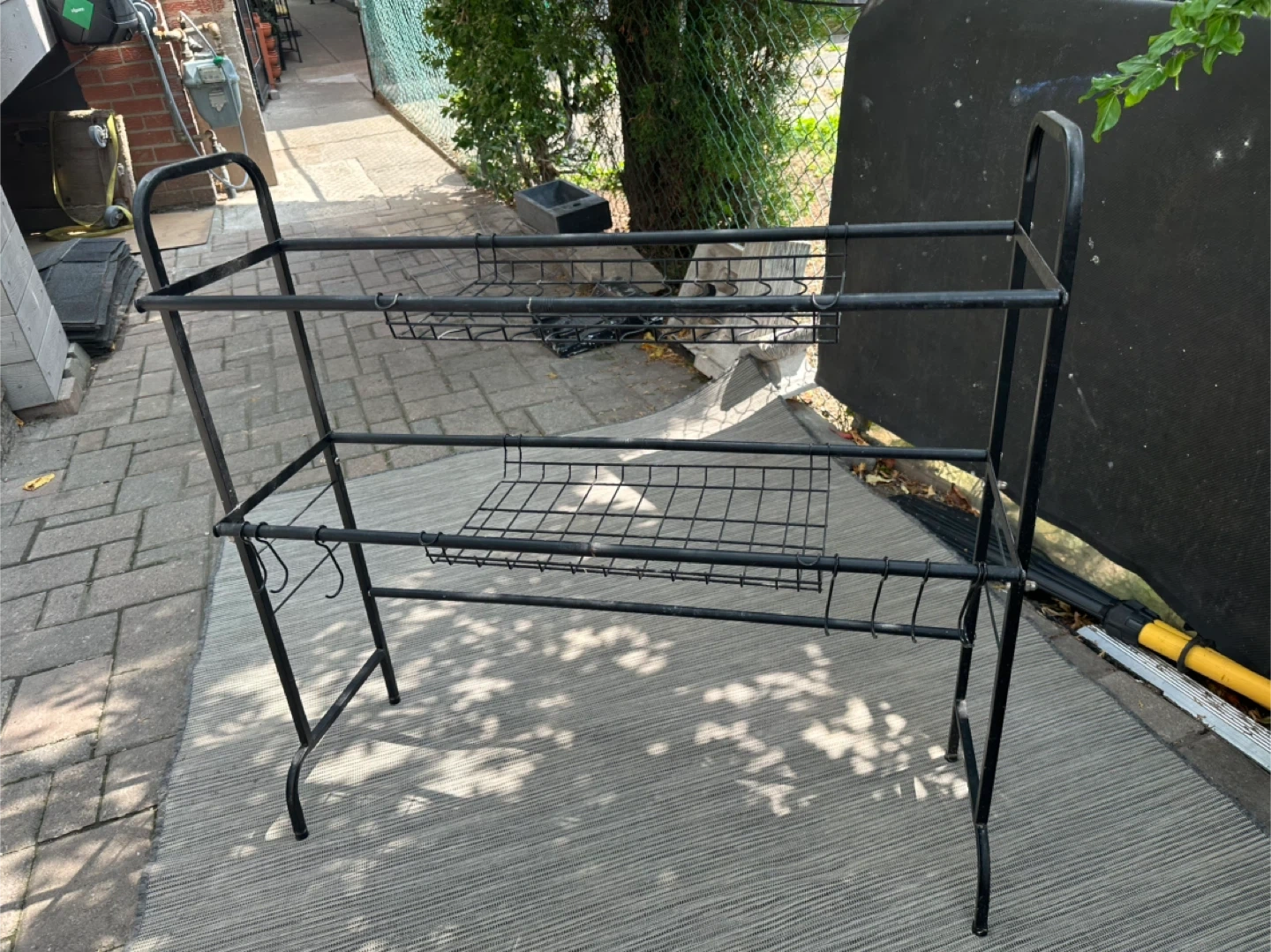 It has two shelves with wire baskets and hooks on the side for hanging tools or smaller plants.