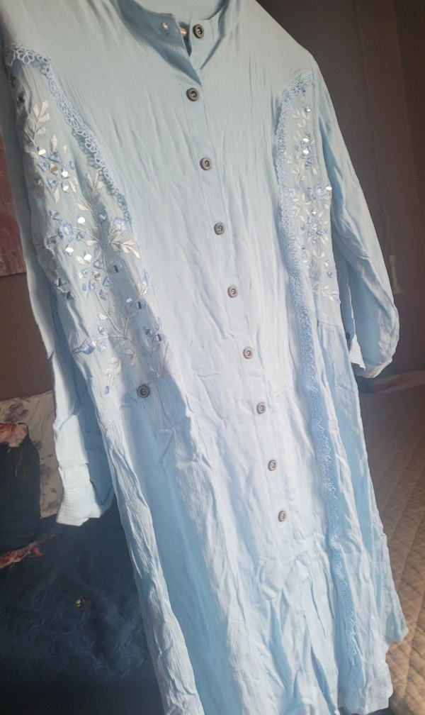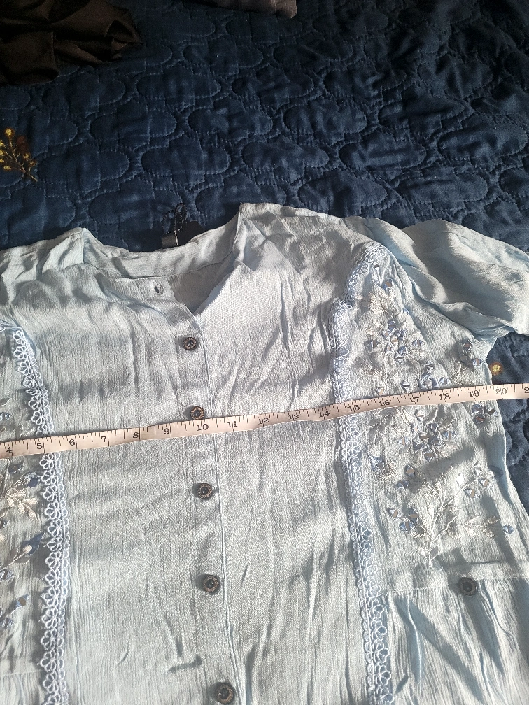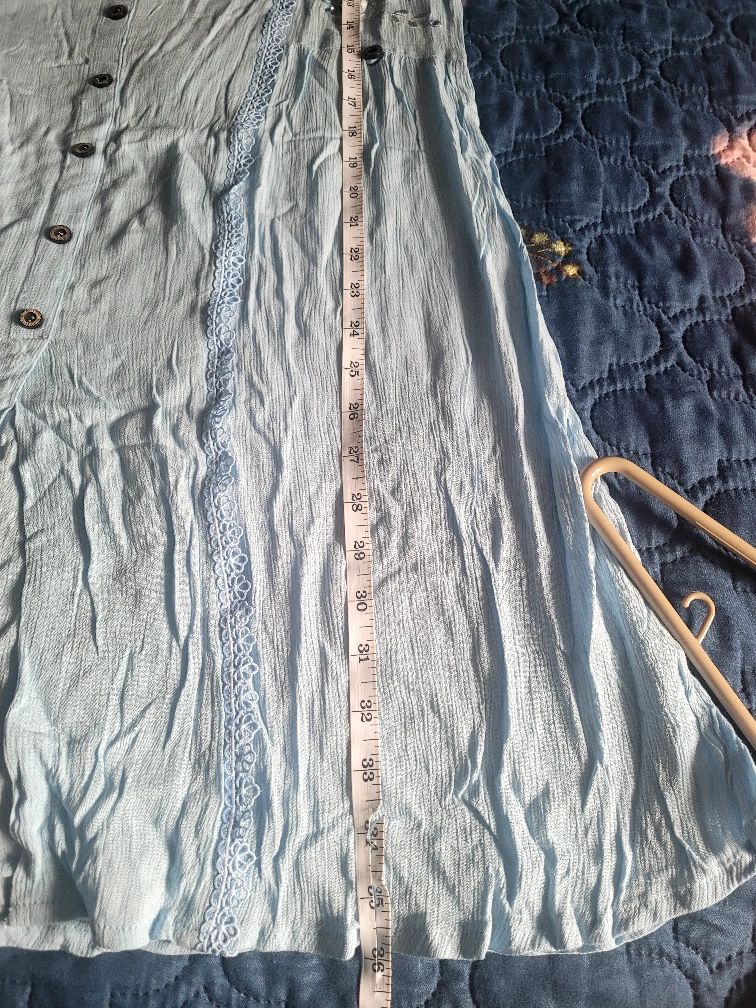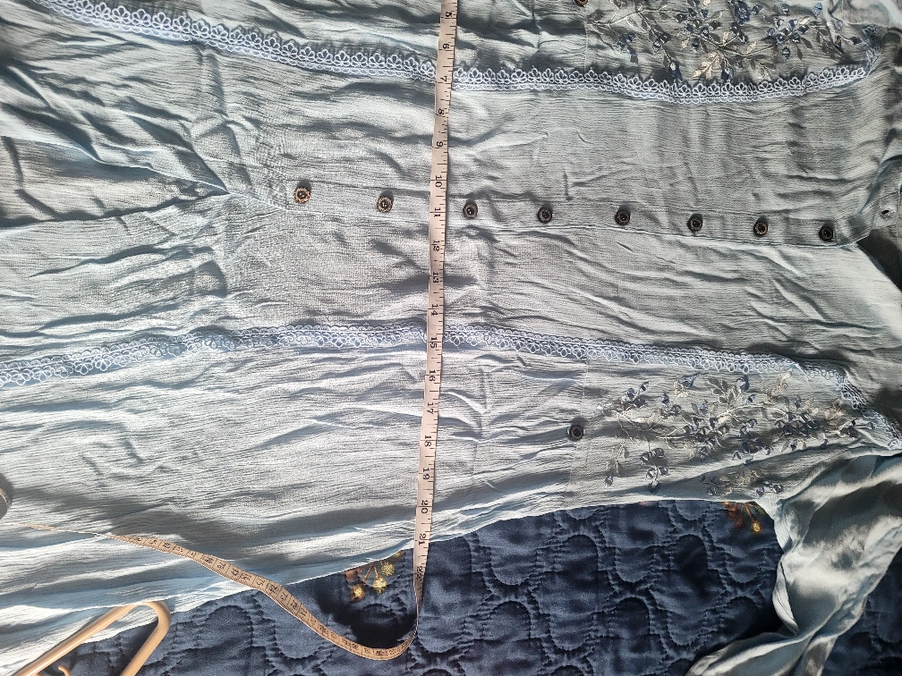 Selling a lovely light blue dress with delicate embroidery. It's in great condition and measures approximately 36 inches in length and 20 inches across the chest. Perfect for spring or summer!
