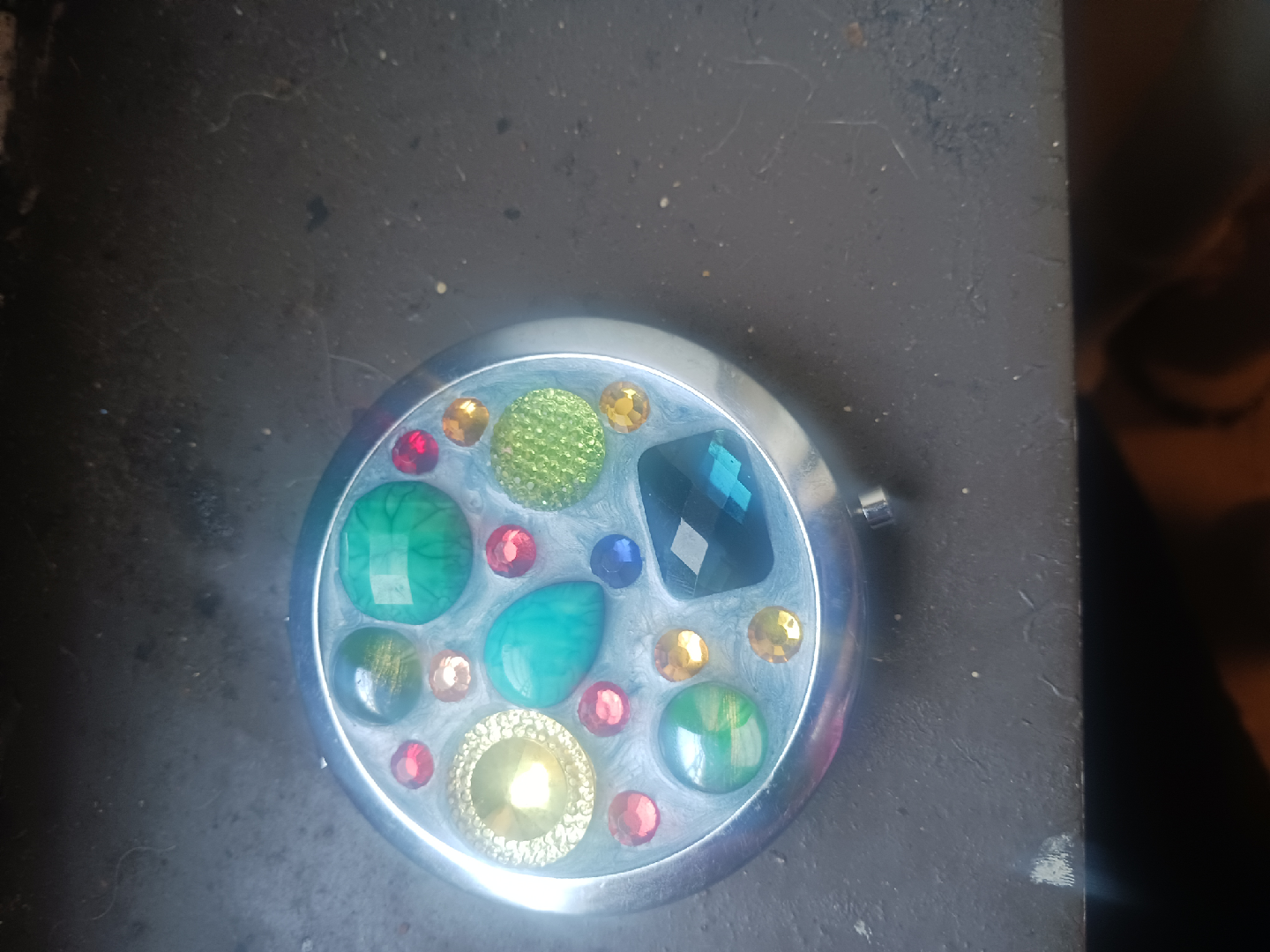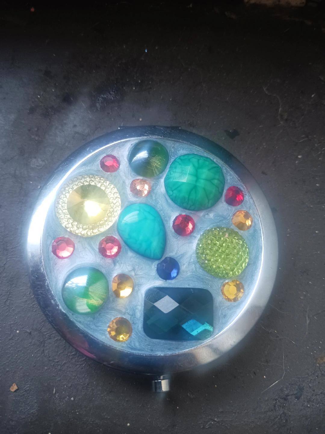 This is a cute compact mirror with a bunch of colorful jewels on it! It's perfect for throwing in your purse or keeping in your car