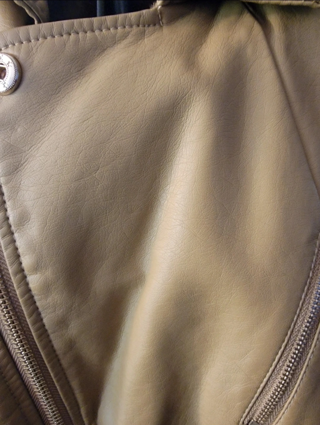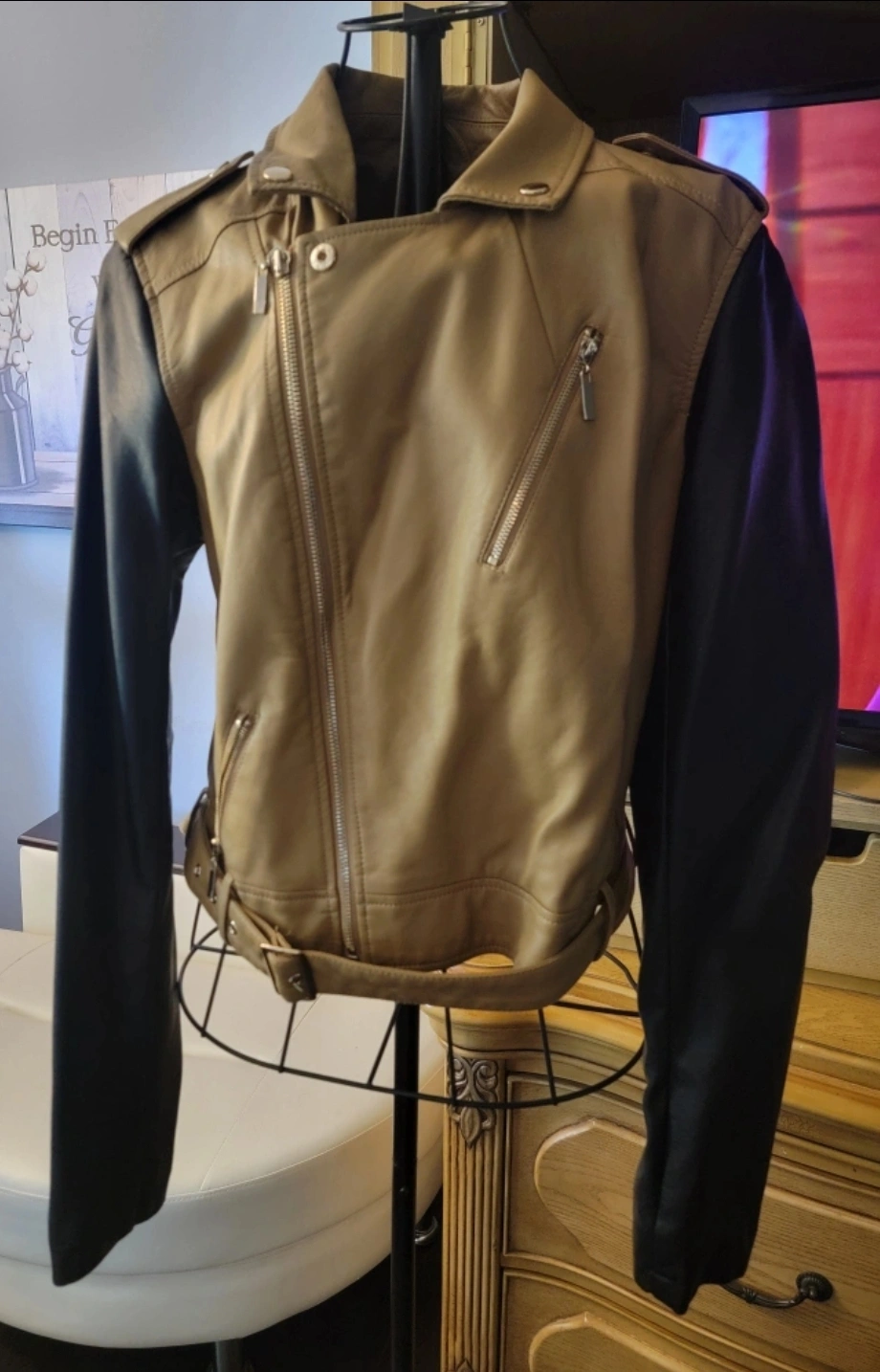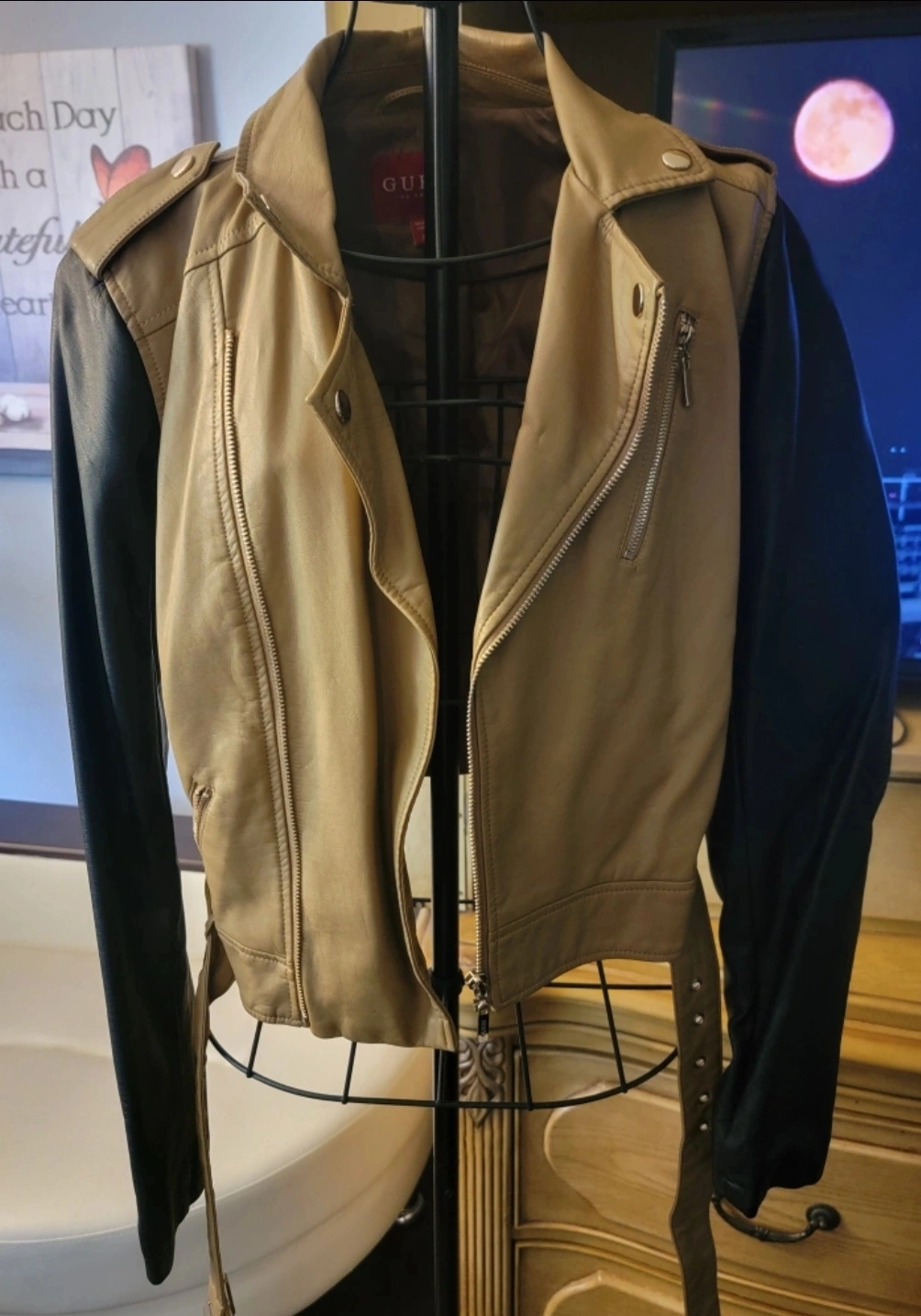Stylish Guess moto jacket featuring a unique beige and black colour combination. This jacket is perfect for adding an edgy touch to any outfit. It has a comfortable fit and is in great condition!