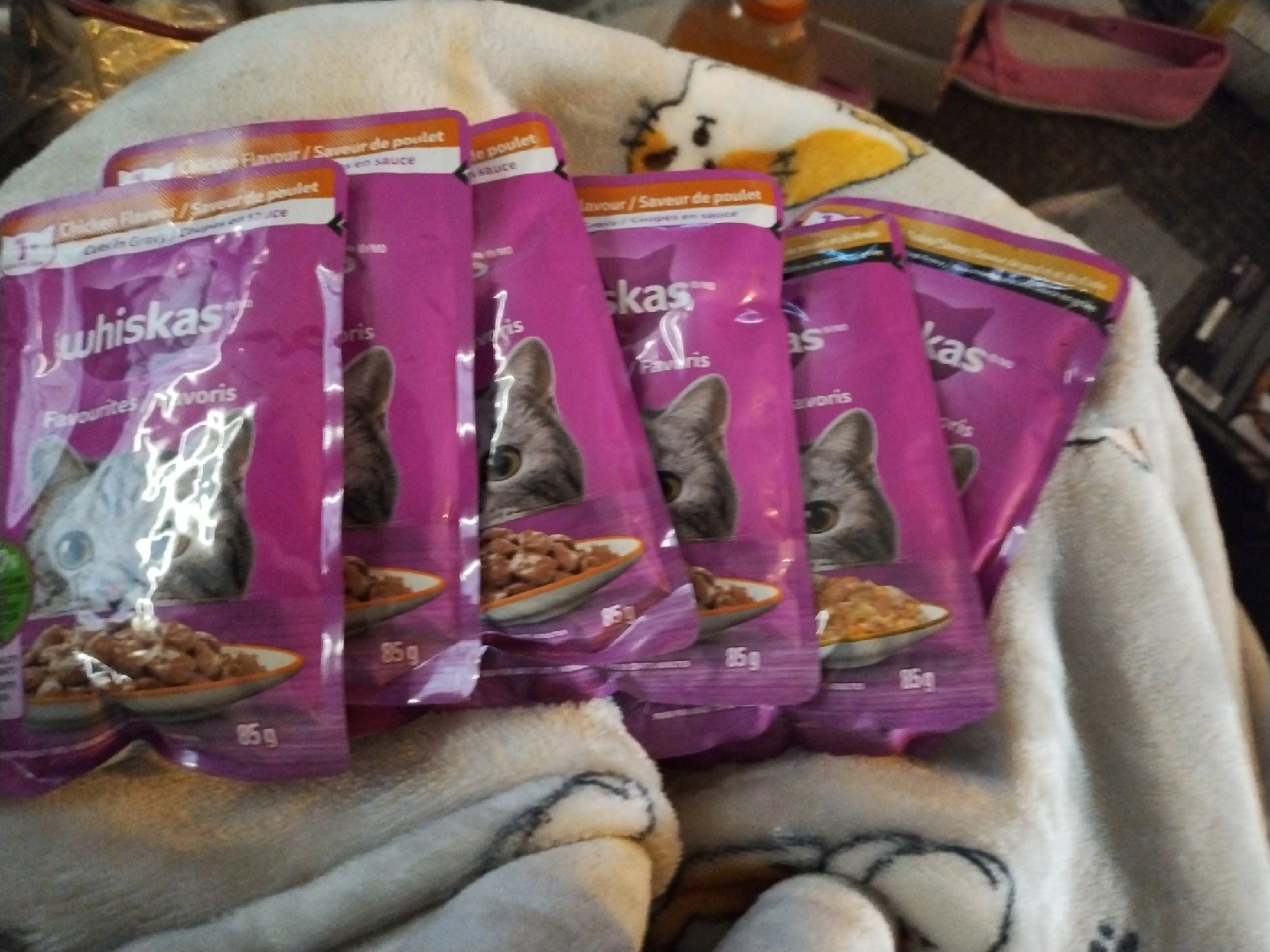 Selling a bunch of Whiskas Favourites cat food pouches! They're the chicken, and chicken and turkey flavour. my cat doesn't like them. Each pouch is 85g. Perfect for keeping your furry friend happy and well-fed. there are 7 pouches.