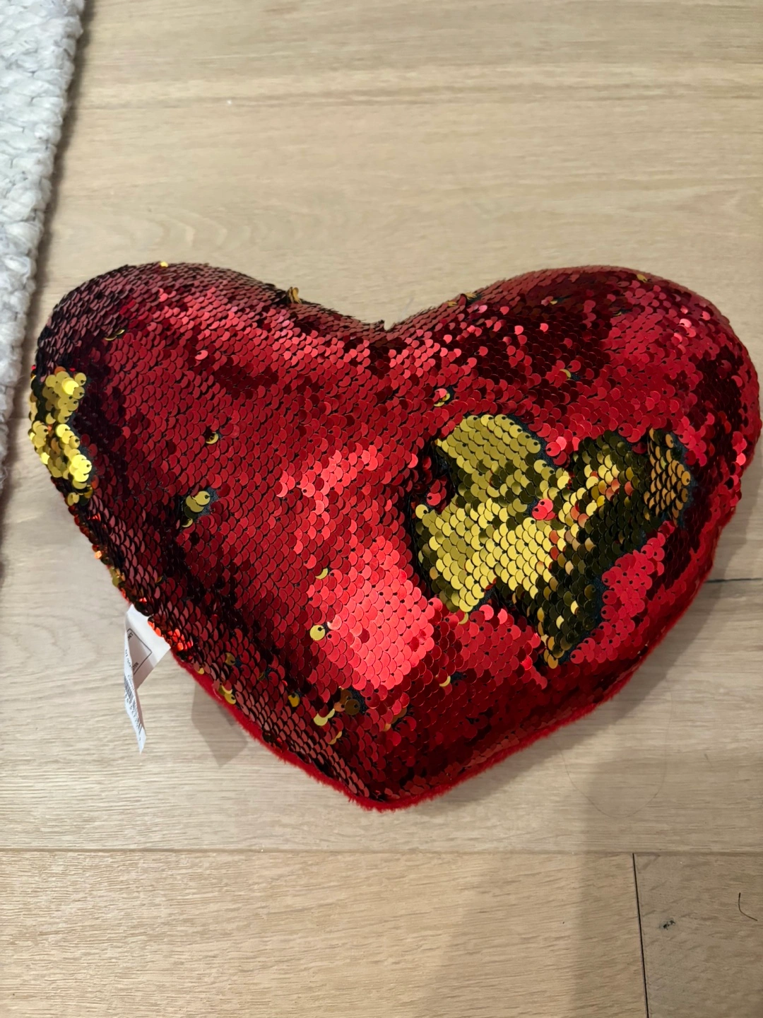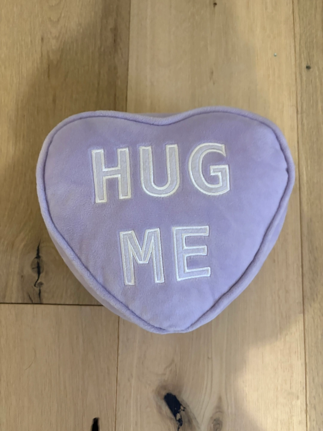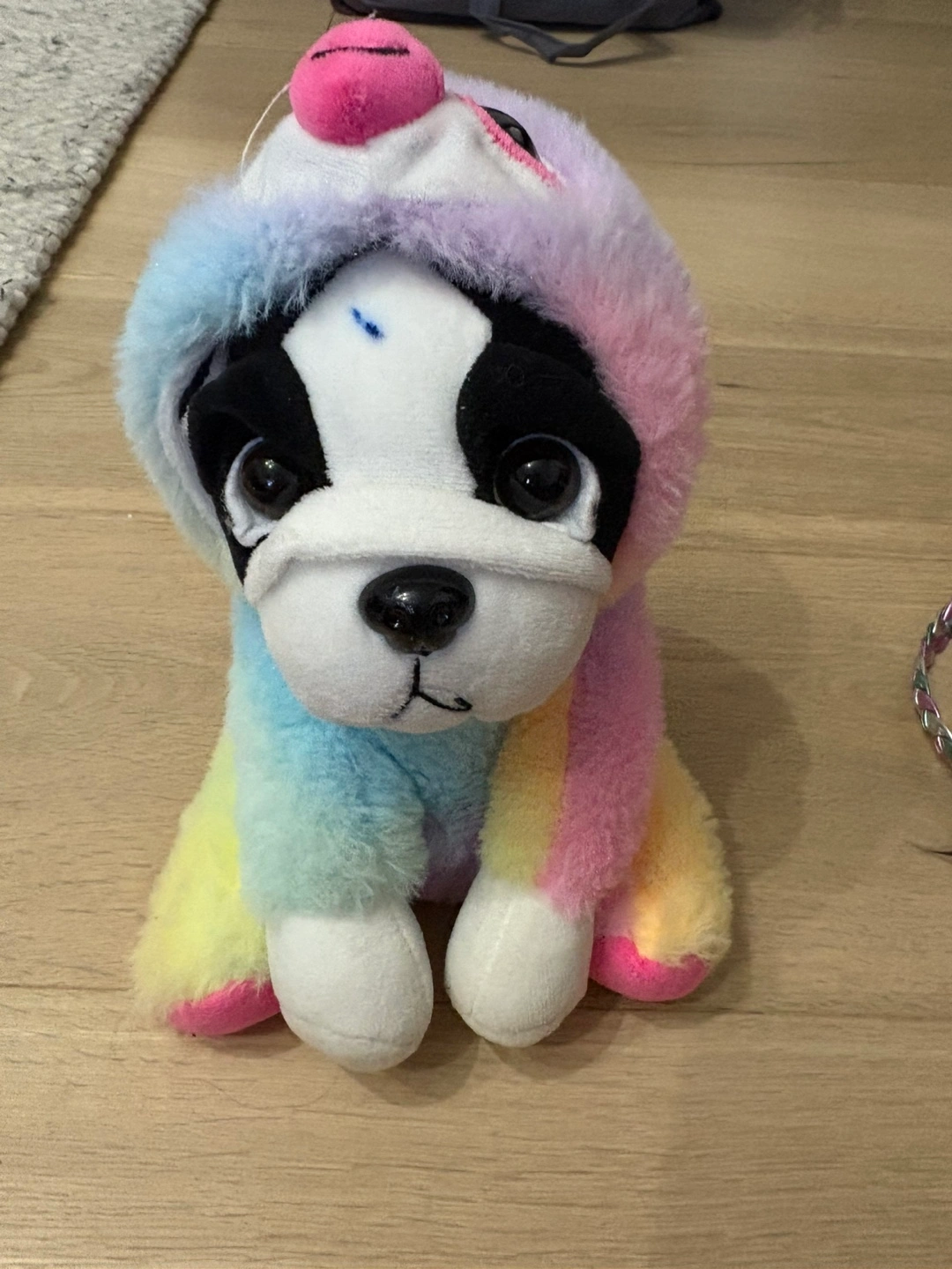 A collection of assorted plush toys, including a reversible sequin heart pillow, a rainbow leopard print plush, a purple cat plush, a lavender "HUG ME" heart pillow, and a rainbow dog plush. They are in great condition and ready for a new home!