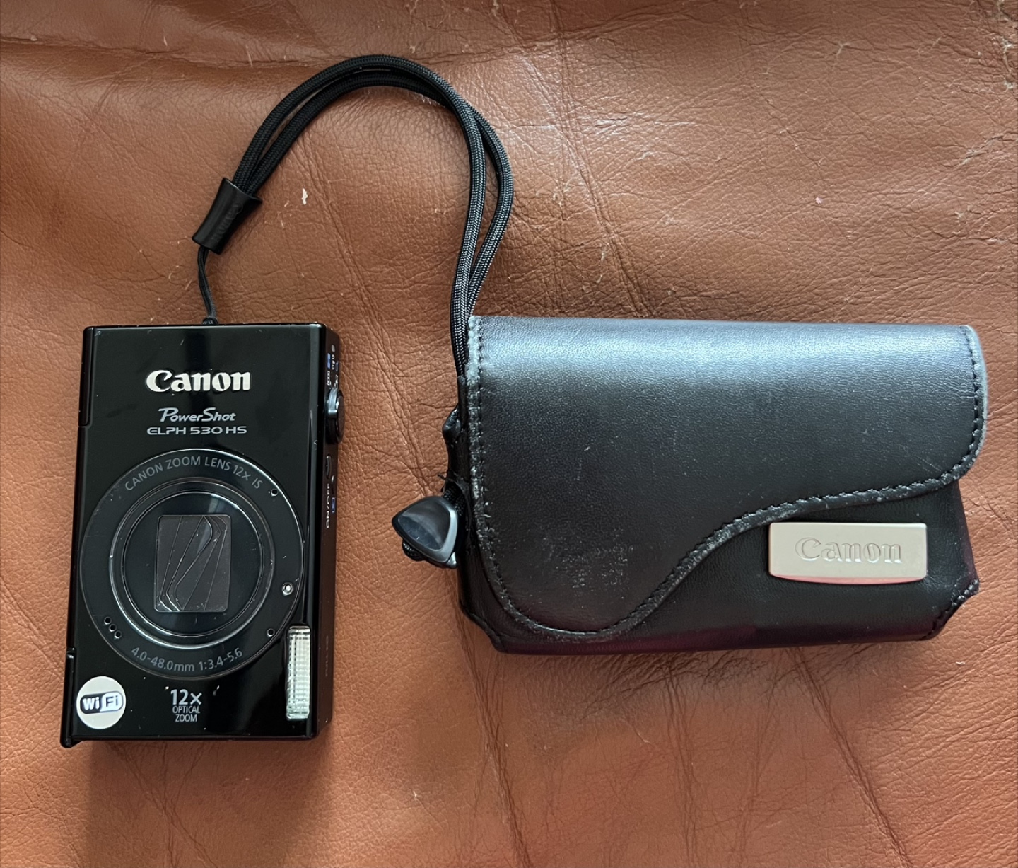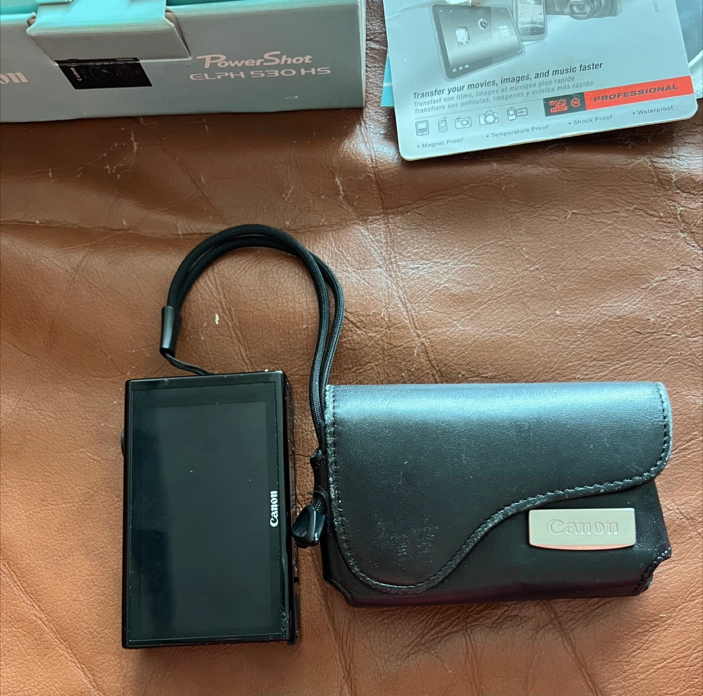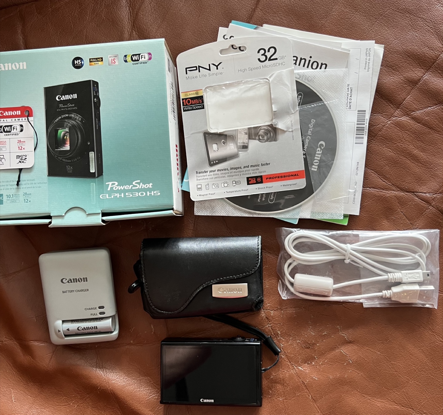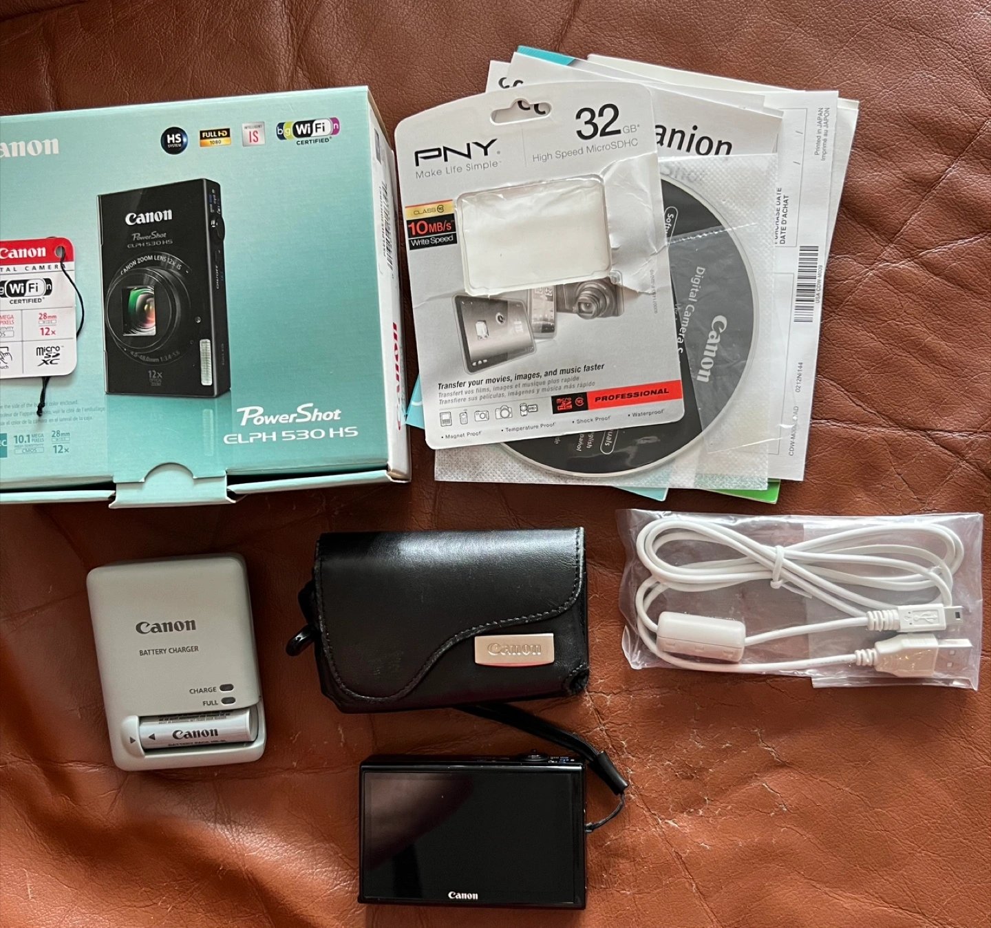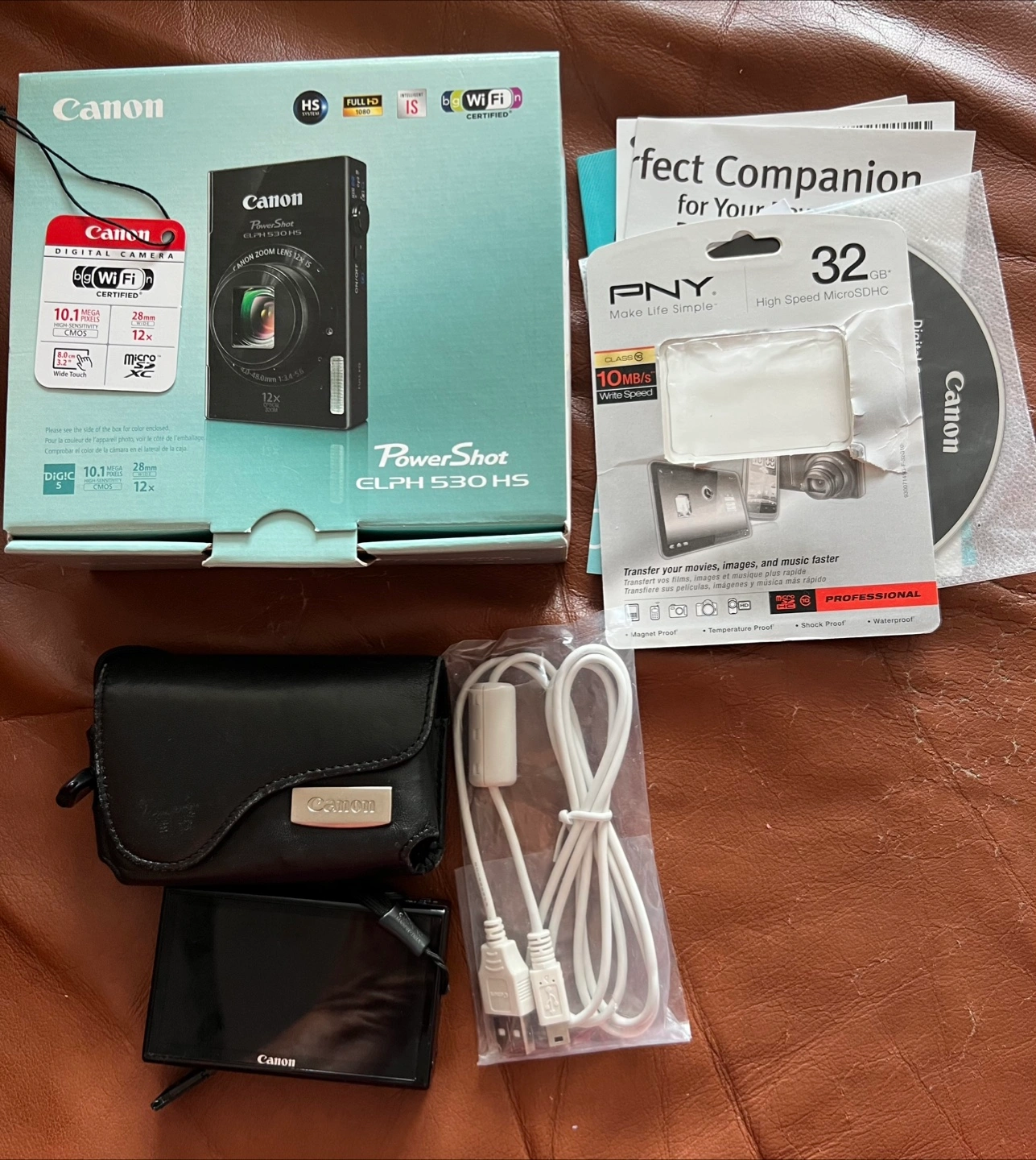 Selling a Canon PowerShot ELPH 530 HS digital camera. It comes with the original box, a PNY 32GB High Speed MicroSDHC card, a Canon digital camera solution disc, a camera case, and a USB cable.