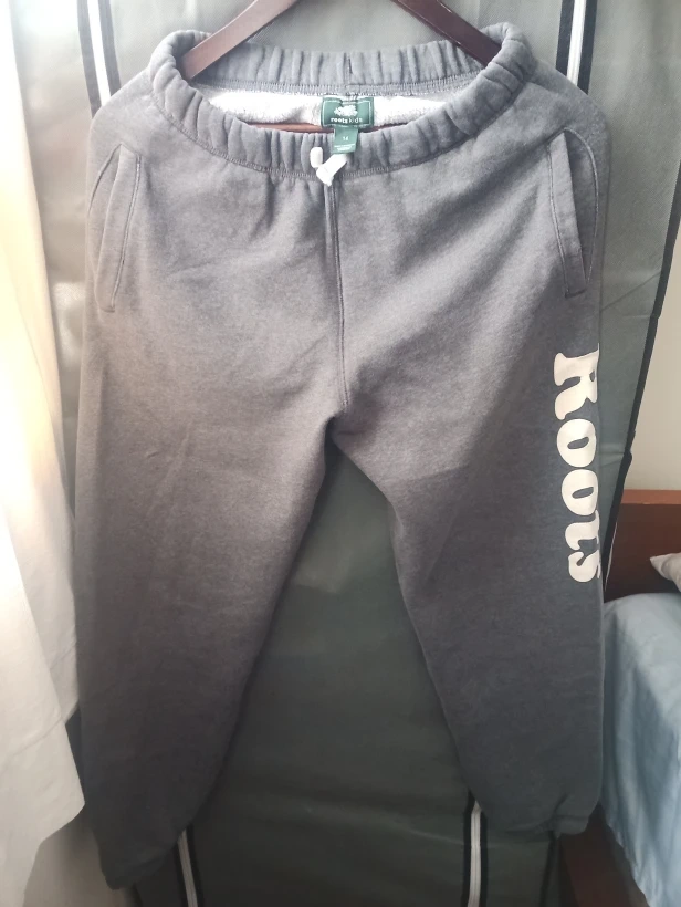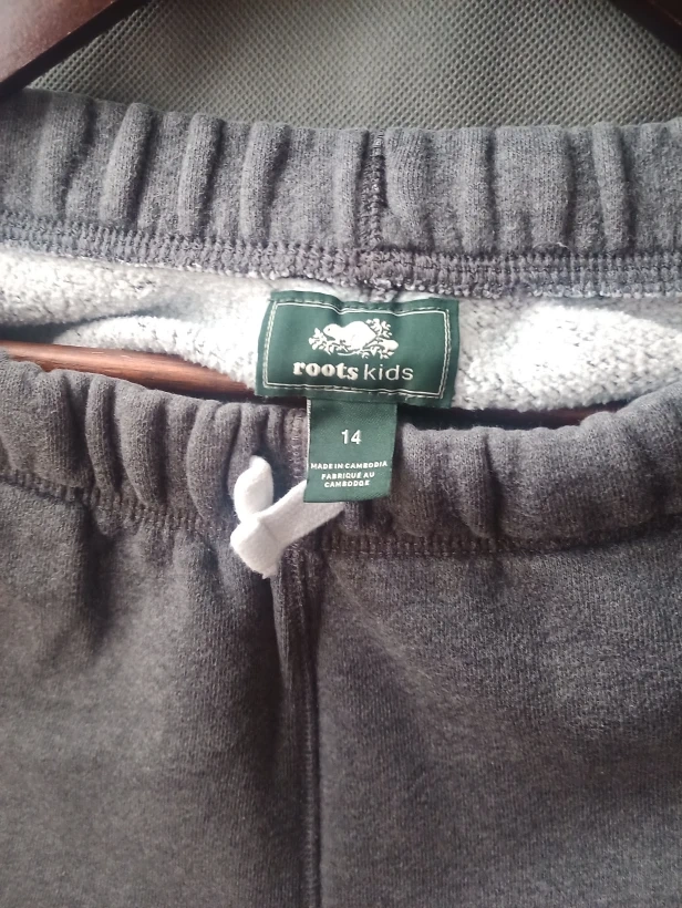 Selling a pair of Roots Kids sweatpants in size 14. They're a comfy grey colour and have the Roots logo on the leg. Perfect for lounging or playing!