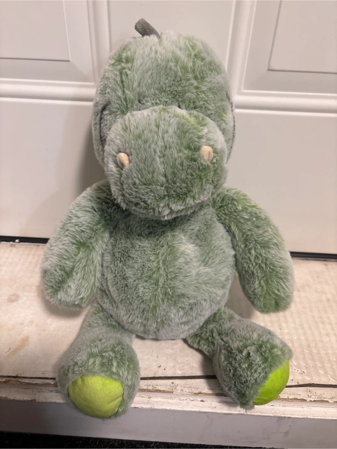 A cute and cuddly green dinosaur plush toy! It's in great condition and ready for a new home. Perfect for kids or anyone who loves dinosaurs
