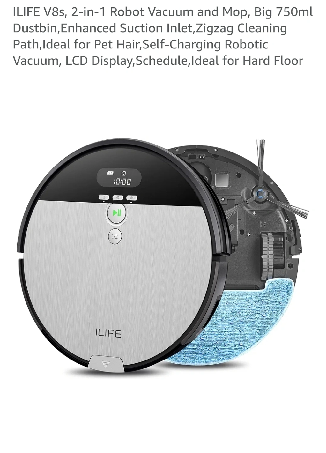 Upgrade your home cleaning routine with the ILIFE V8s, the ultimate 2-in-1 robotic vacuum and mop designed for modern living. Whether you're battling pet hair, crumbs, or dust, this sleek powerhouse delivers spotless floors with minimal effort. ✨ Key Features: - Dual Functionality: Vacuums and mops in one go—perfect for hard floors and everyday messes. - Massive 750ml Dustbin: Handles more debris with fewer emptying interruptions. - 4000Pa Suction Power: From fine dust to chunky particles, nothing escapes its grip. - Zigzag Cleaning Path: Intelligent navigation ensures maximum coverage and efficiency. - HEPA Filtration System: Captures 99.95% of allergens and fine particles for cleaner air. - Obstacle Climbing: Smoothly transitions across surfaces and climbs up to 0.8 inches. - App Control via ILIFEHOME: Customize suction levels, cleaning modes, and schedules from your phone. - Self-Charging & Scheduling: Set it and forget it—your floors stay clean even when you're away. - LCD Display: Easy-to-read interface for quick adjustments and status updates. Whether you're a pet parent, a busy professional, or just someone who loves a tidy space, the ILIFE V8s is your silent cleaning companion that works smarter, not harder.