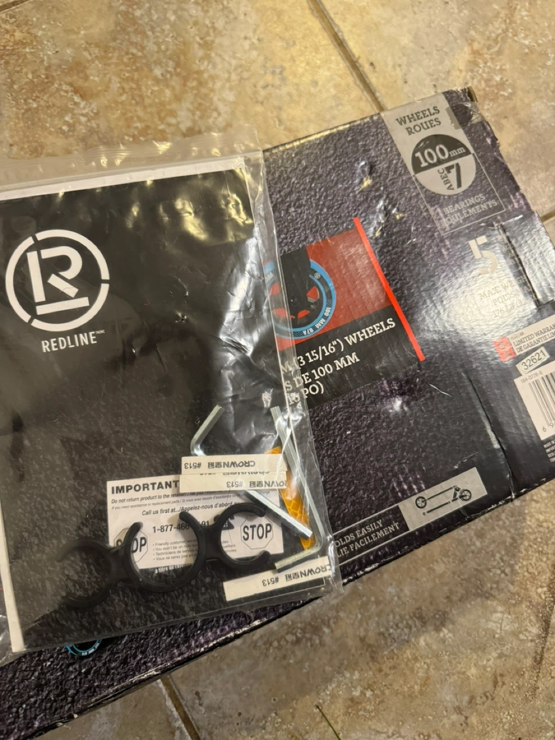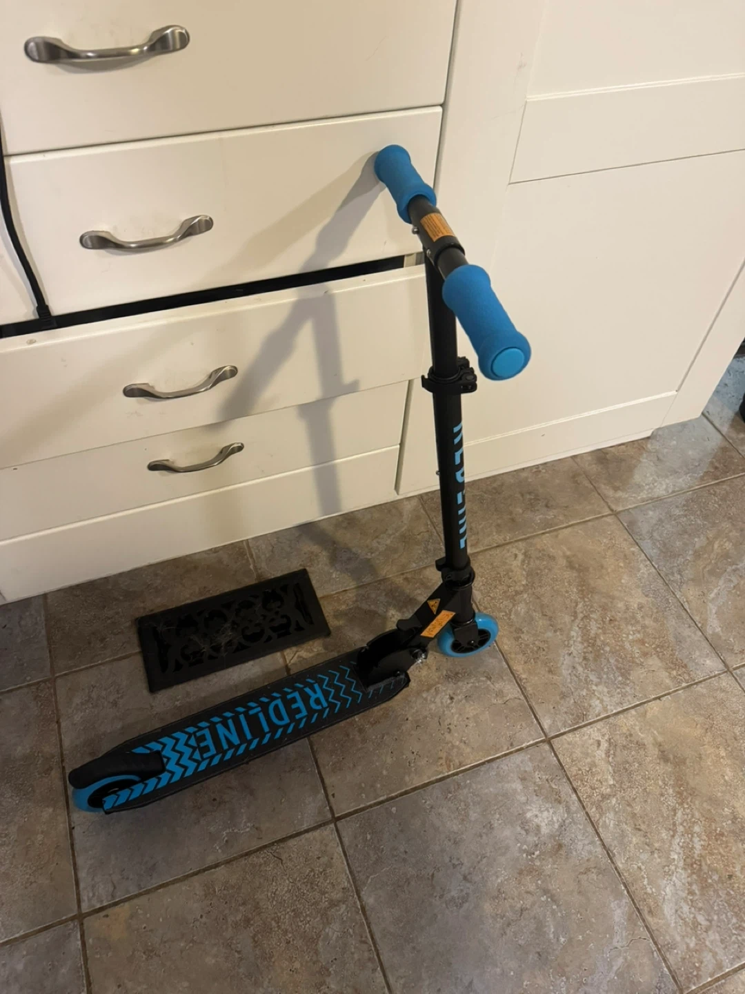 Selling a Redline Cadet folding scooter in black and blue! It features 100mm wheels and a heavy-duty alloy deck. It also folds easily for storage and transport. Comes with original box and components!