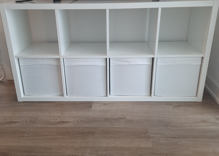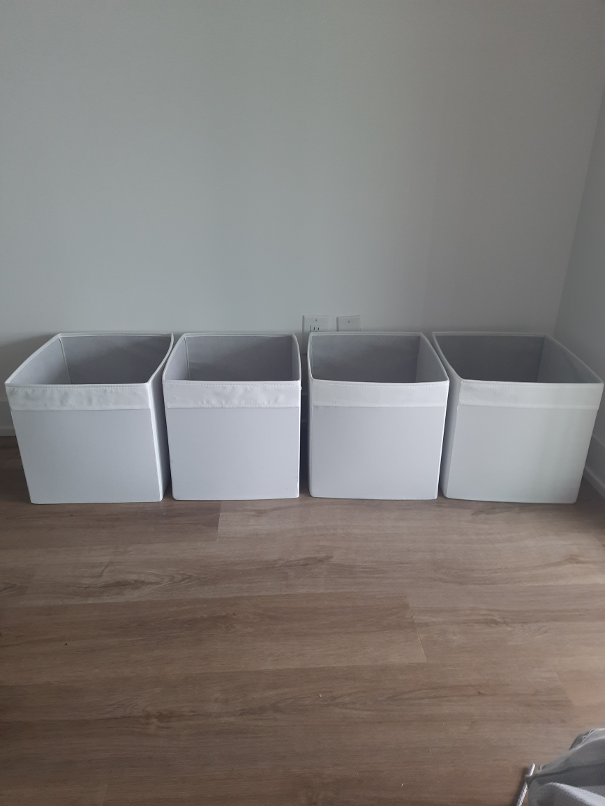 Selling a set of 4 IKEA Drona storage boxes in white. They're in great shape and perfect for organizing your things in a Kallax or similar shelving unit. These are super handy for decluttering and keeping your space tidy!