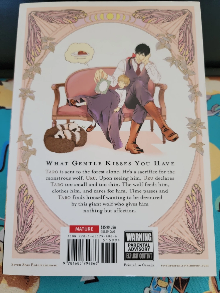 Selling a copy of "Why Don't You Eat Me, My Dear Wolf?" by Ao Koishikawa! It's a mature manga published by Seven Seas Entertainment. The story follows Taro, who is sent to the forest as a sacrifice for a monstrous wolf. The wolf feeds him, clothes him, and cares for him. It retails for $19.99 CAD.