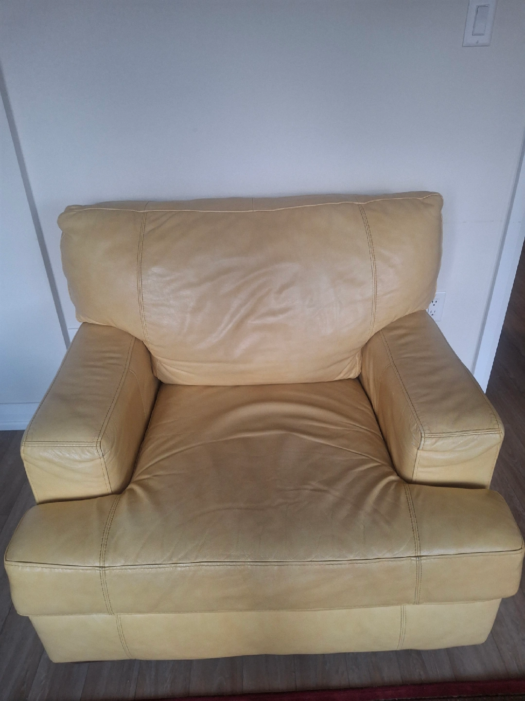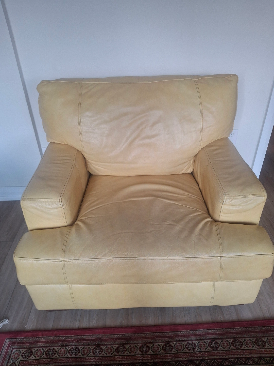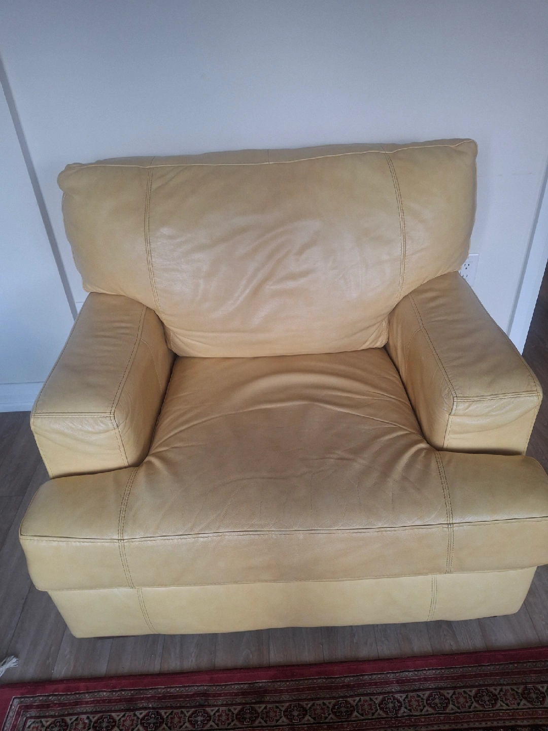 Selling a comfortable armchair! It's a lovely yellow colour and made of leather. It's perfect for a cozy reading nook or just relaxing after a long day. It's in good condition and ready for a new home