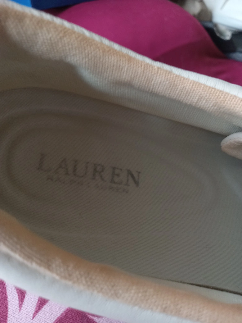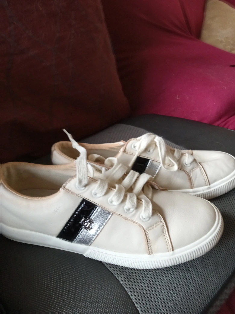 405Selling a pair of Ralph Lauren sneakers in cream colour. They have a black and silver stripe detail on the side. They are in good condition and ready for a new home