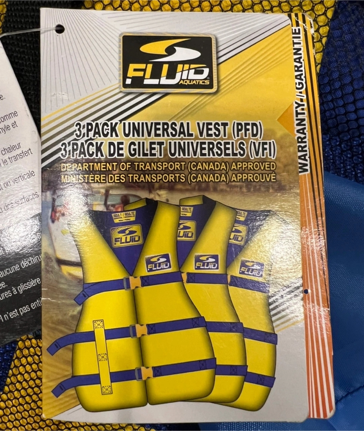Selling a Fluid Aquatics 2-pack of universal vests (PFD). These are Department of Transport (Canada) approved. They come in a blue carrying bag. Great for boating or other water activities!
