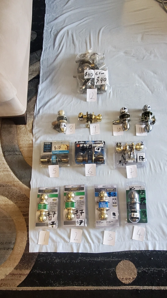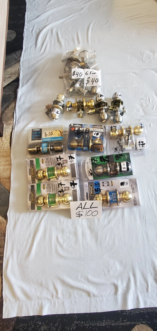 I have a lot of door knobs for sale. There are various brands and styles. Some are still in their packaging. Please see photos for details.