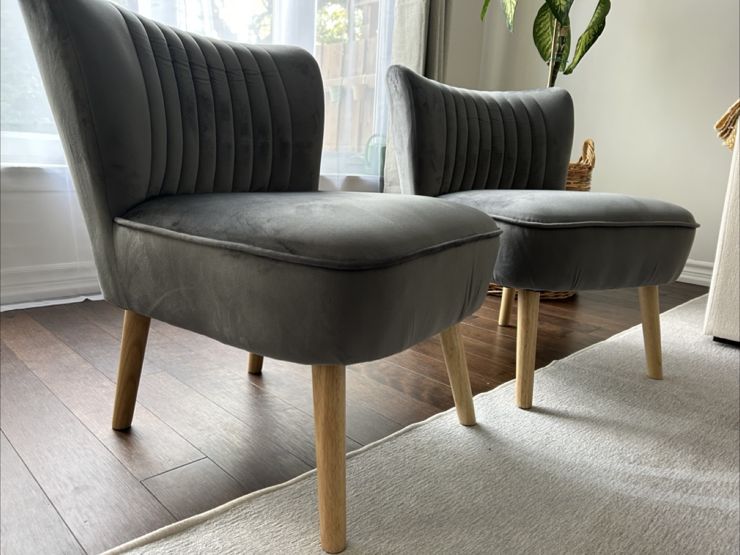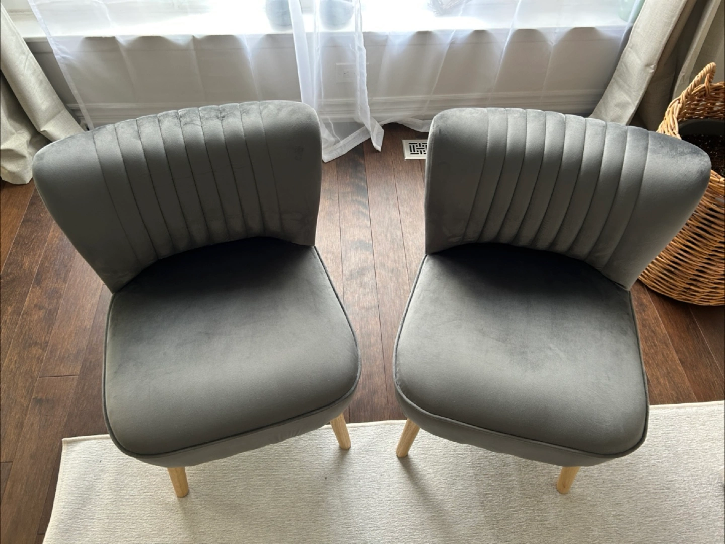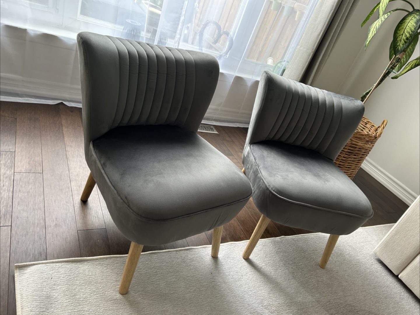 Selling a set of two NEW stylish grey velvet accent chairs! They’re in perfect condition and would look lovely in any living space. The velvet material gives them a luxurious feel, and the neutral grey colour makes them easy to match with existing decor