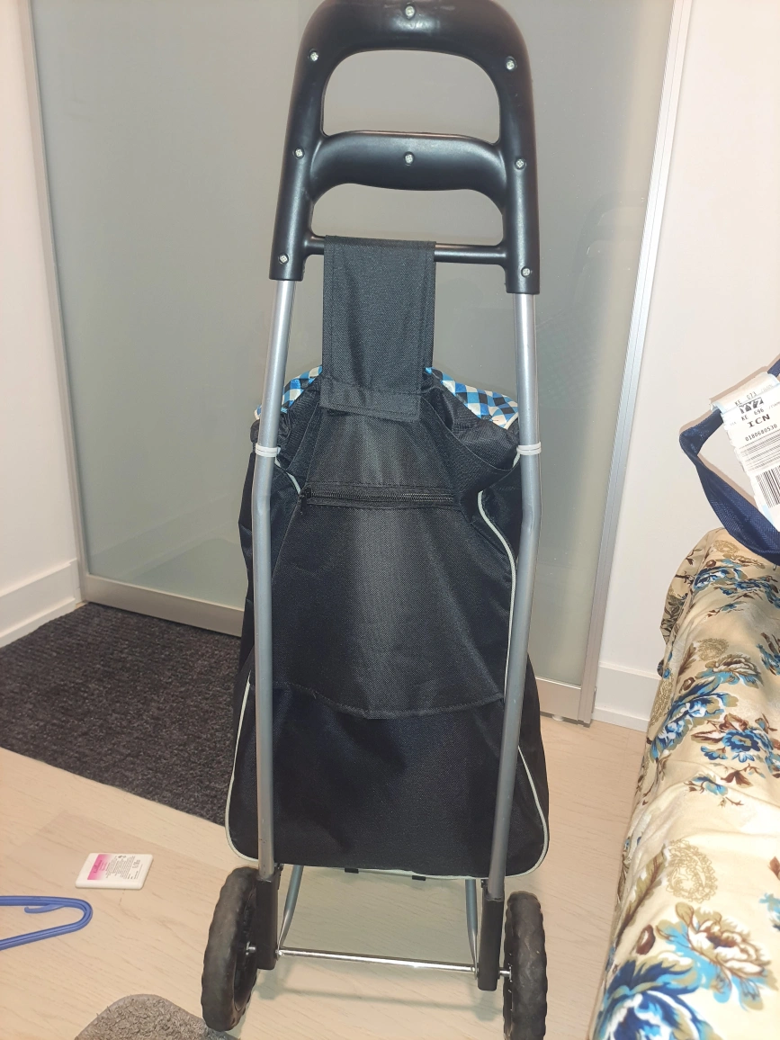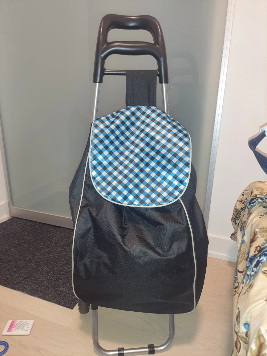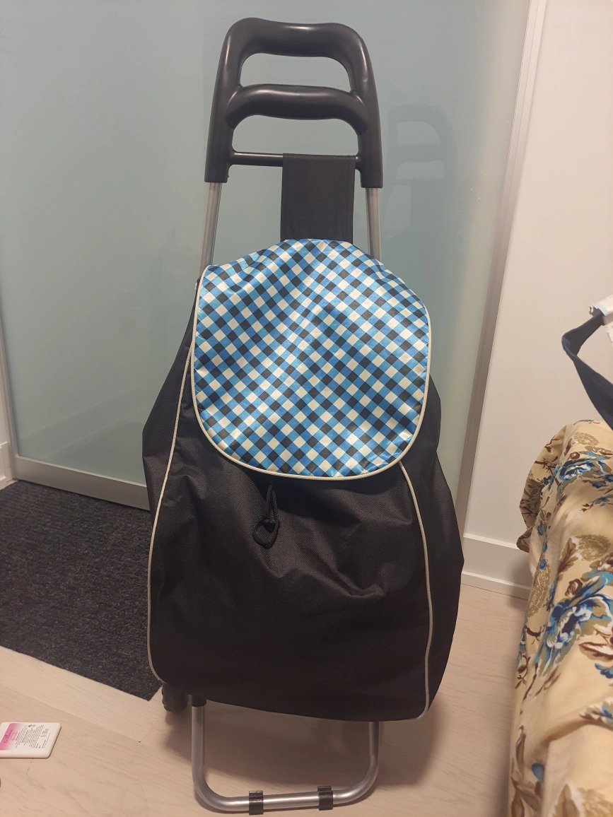Selling a handy shopping trolley bag! It's black with a cute blue and white checkered pattern on the flap. Perfect for carrying groceries or anything else you need to lug around. Makes shopping a breeze!🥕