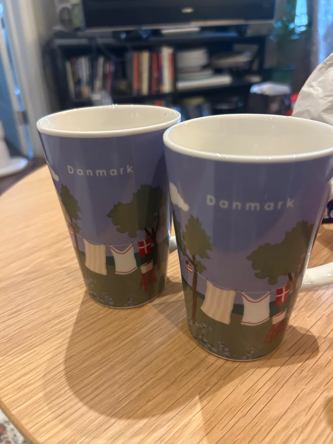 Selling a set of two Danmark mugs. They feature a cute design with trees and clotheslines. Perfect for your morning coffee or tea!