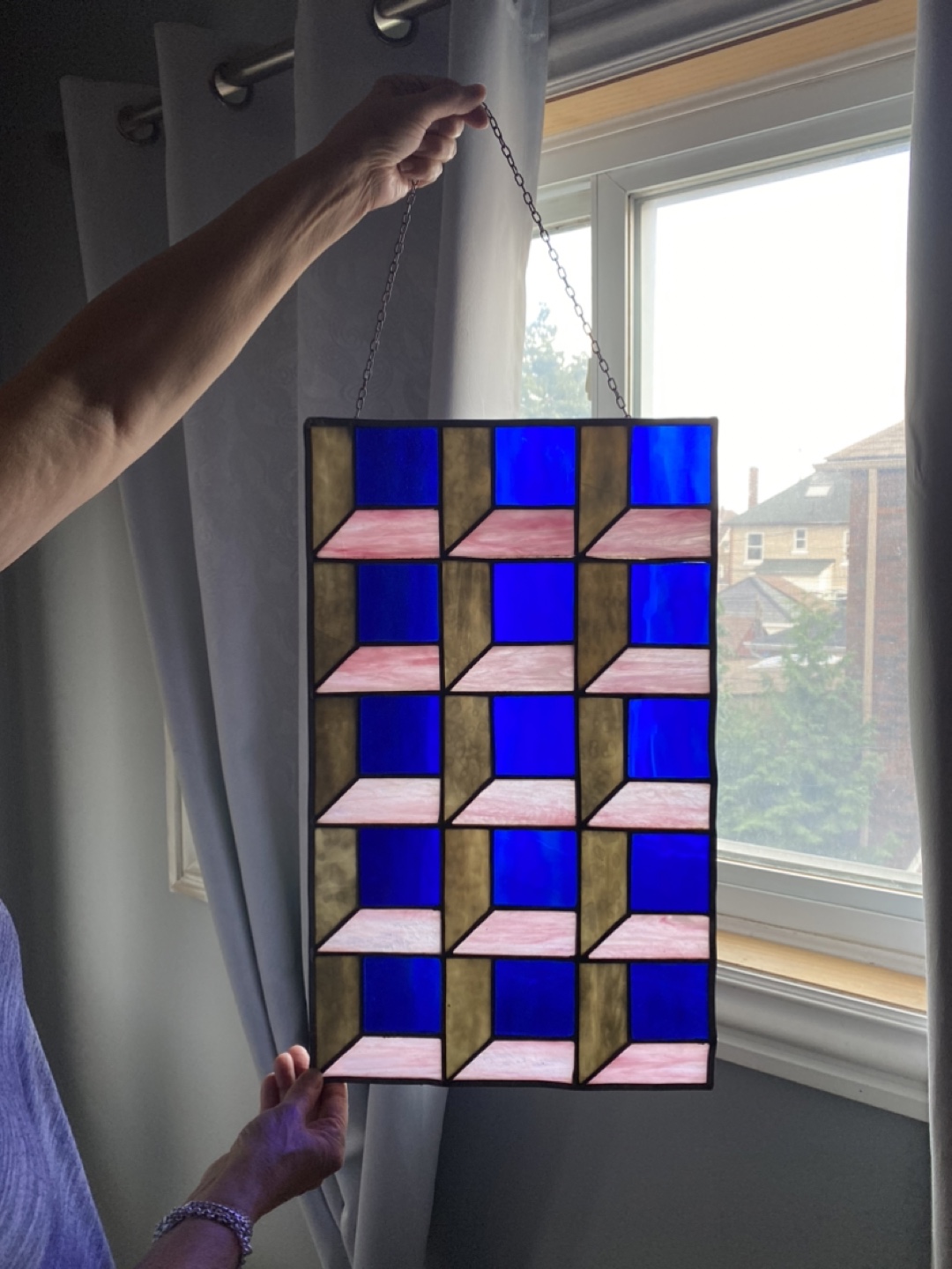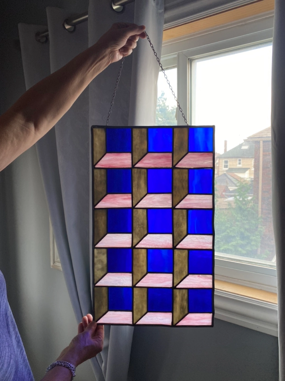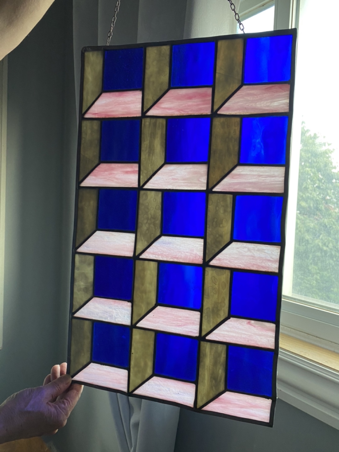 This is a beautiful stained glass panel featuring a cool geometric design! The colours are really vibrant, with blues, pinks, and gold tones. It's a unique piece that would look great hanging in a window or as a decorative element in any room