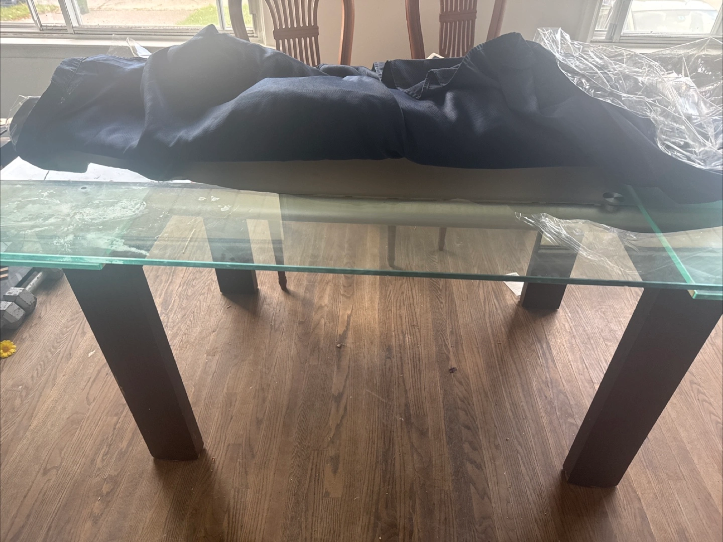 dining table along with 6 chairs. The table has a glass top and dark brown legs. The chairs are wooden with patterned fabric seats. Great for a small dining area!