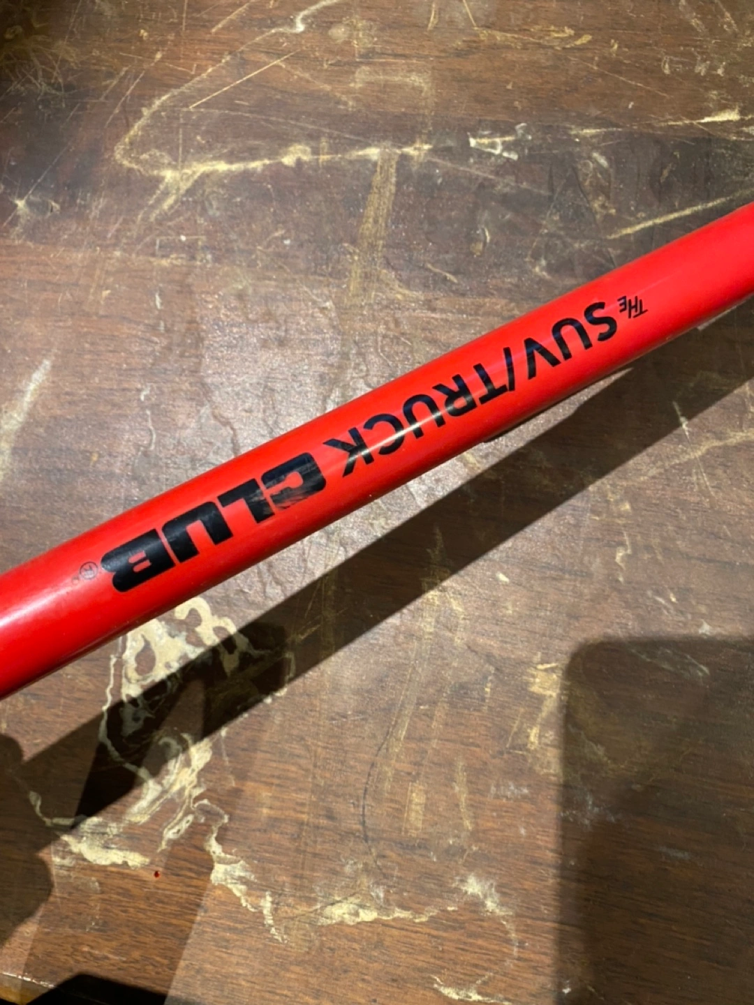 Selling a steering wheel lock from The SUV/Truck Club! It's red and gold and comes with keys. Keeps your vehicle safe and secured